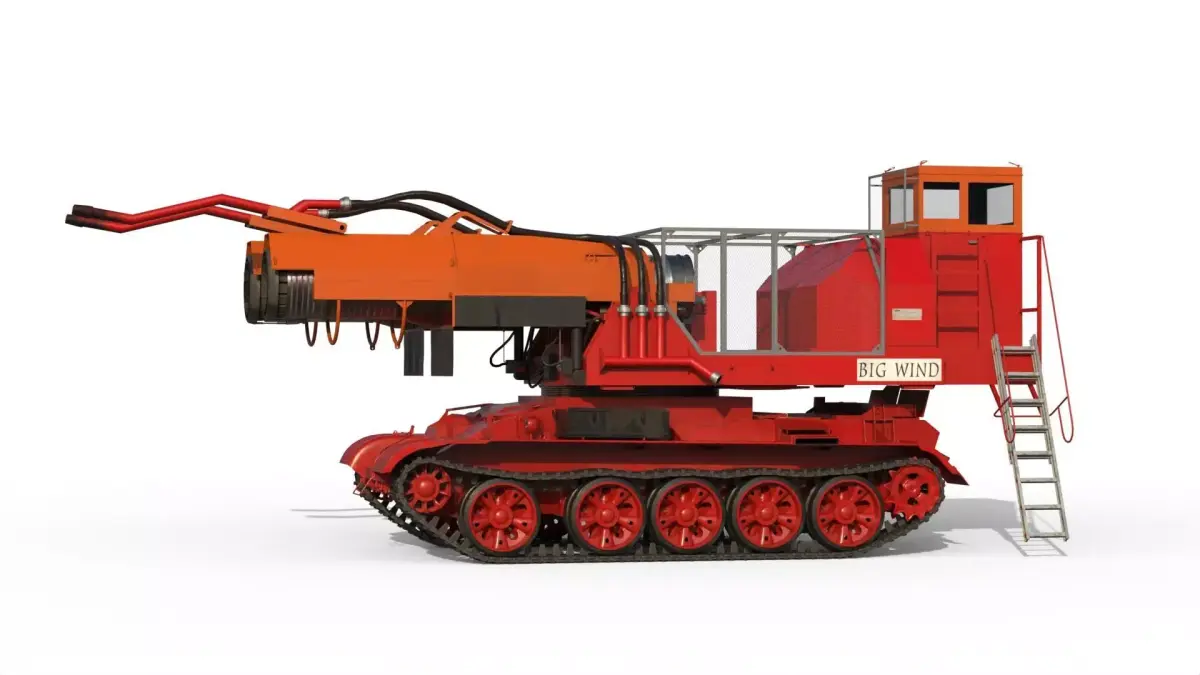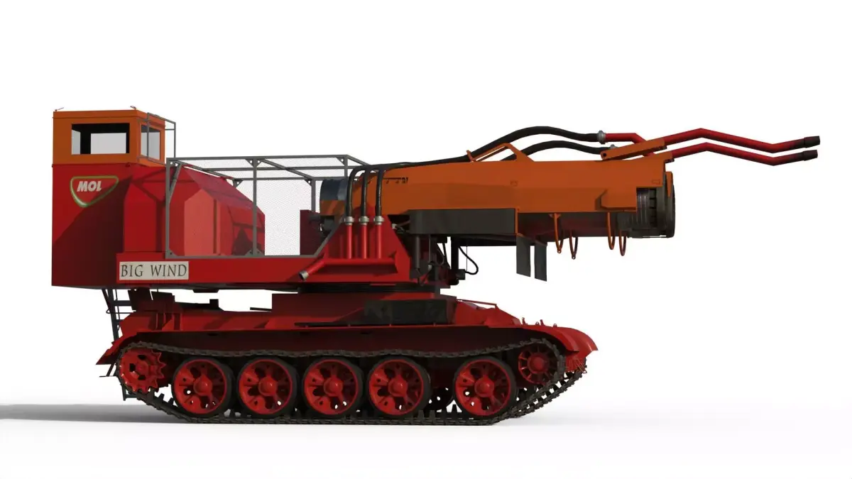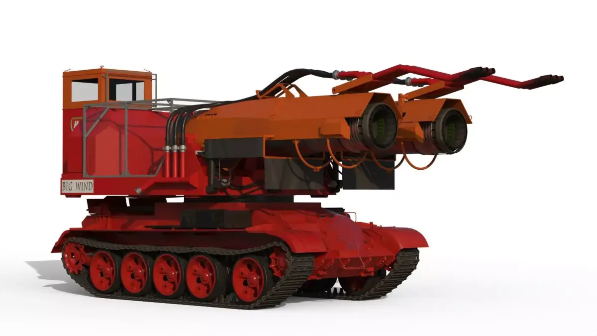 Big Wind is a Hungarian firefighting tank designed to extinguish oil well fires, built by mounting two MiG-21 jet engines onto a repurposed Soviet T-55 tank chassis. It uses a powerful blast of water to smother flames and can pump up to 220 gallons of water per second through six nozzles, creating a massive steam spray. This powerful machine was famously used to help fight fires in Kuwait after the Gulf War.