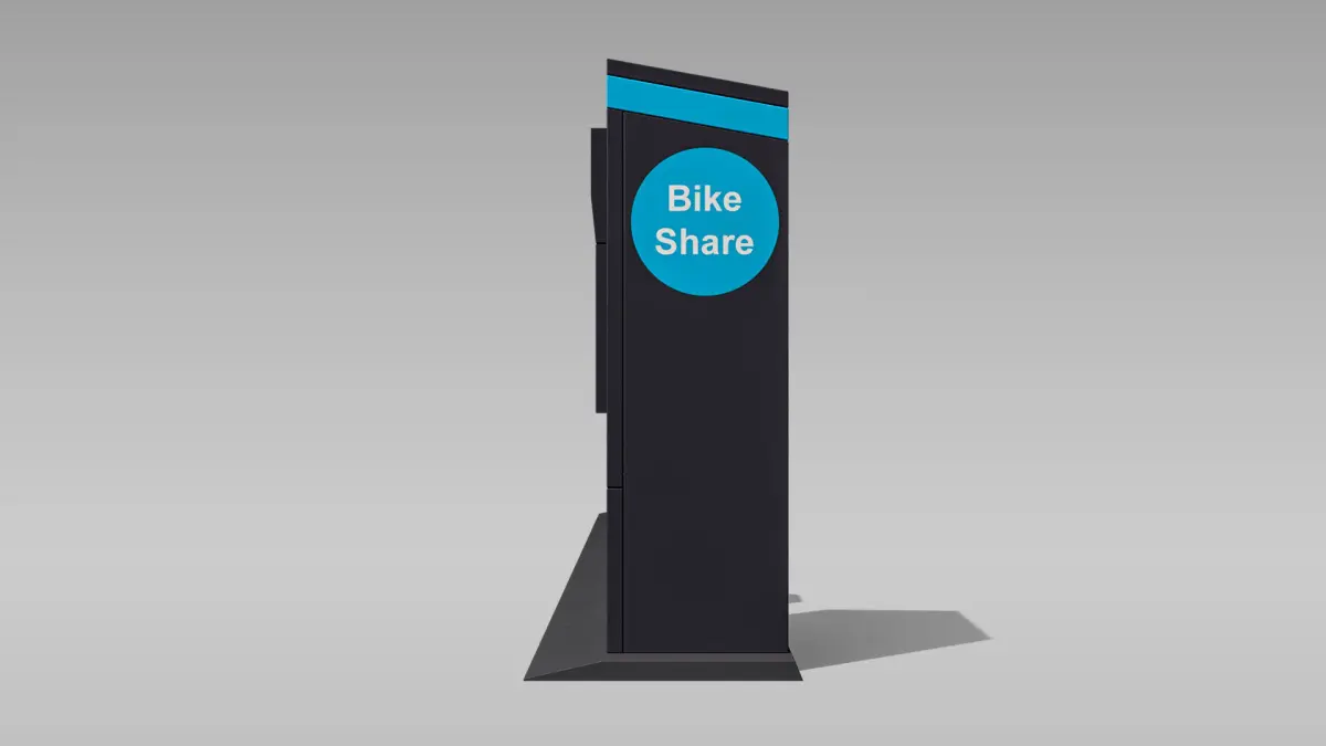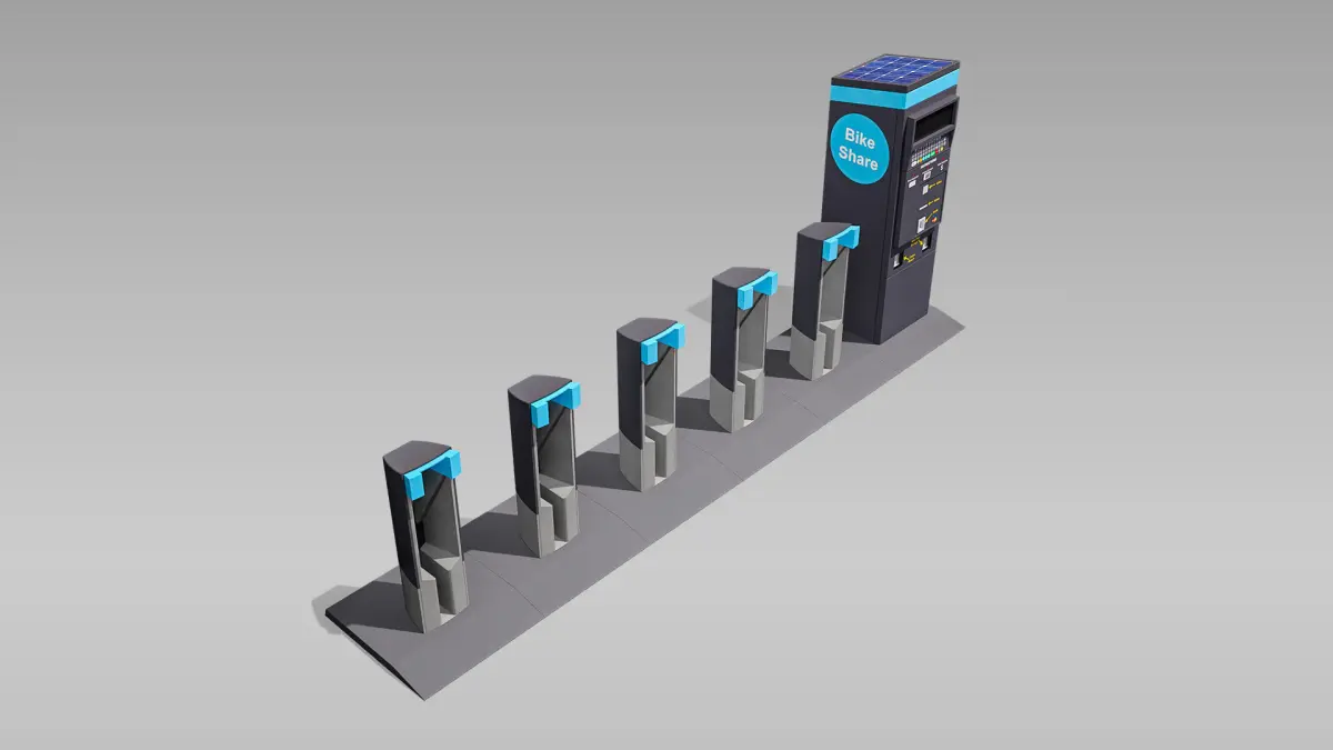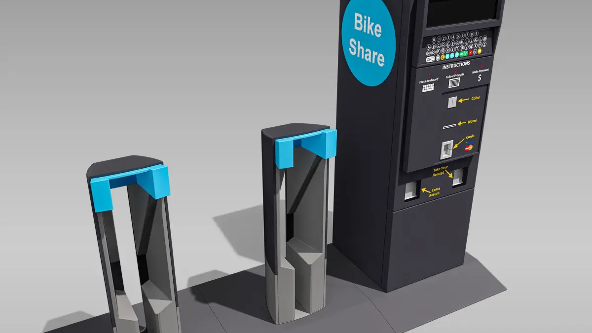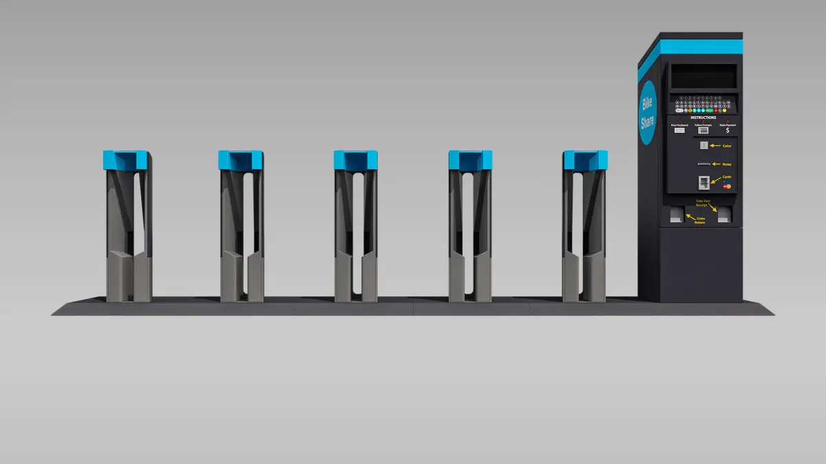 Detailed 3D model of a bike station, modeled and rendered in Cinema 4D. The model was created using approximate real world dimensions.