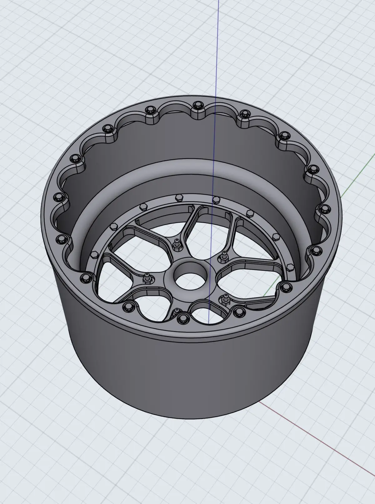 Designed as a 3 piece for higher detail printing, details include a seperate wheel centre, hoop, and outer beadlock, and bolt/fastener details.