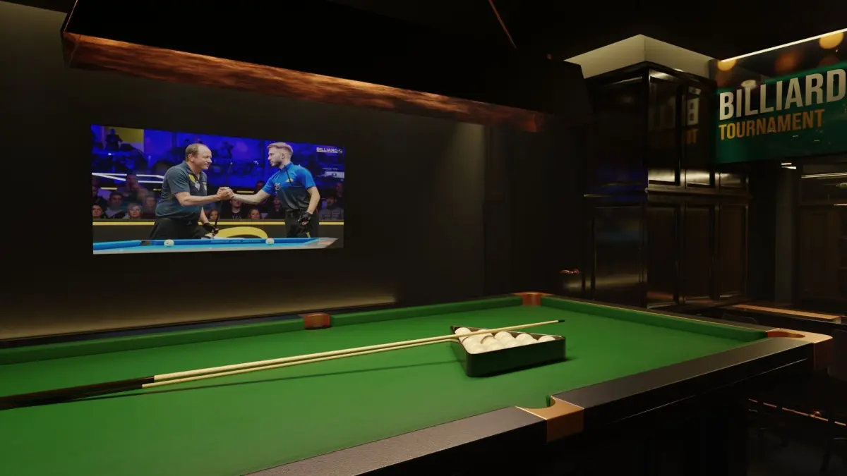 - Complete scene with billiard table, cues, balls, lighting fixtures, furniture, wall decor, and environment props