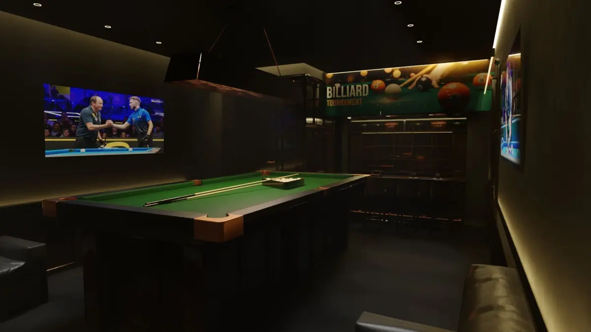 - High-quality 3D model of a modern billiard room, ideal for architectural visualization, animations, games, and virtual environments. This complete interior scene includes everything you need to create a stylish and realistic billiards atmosphere.