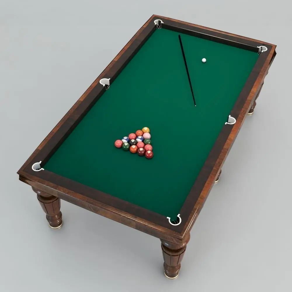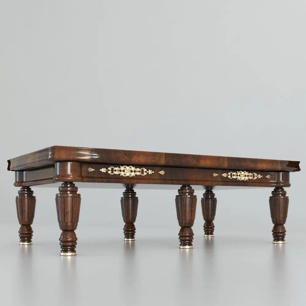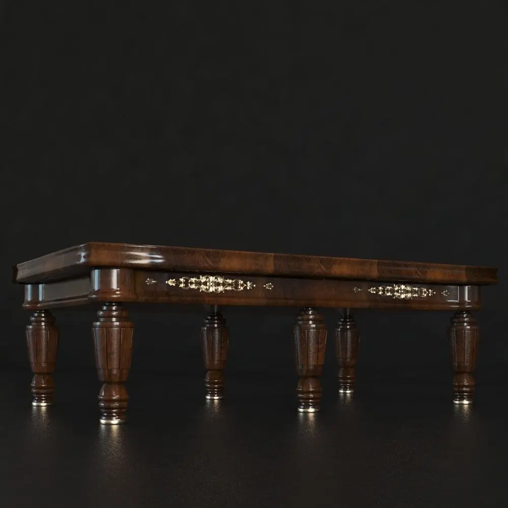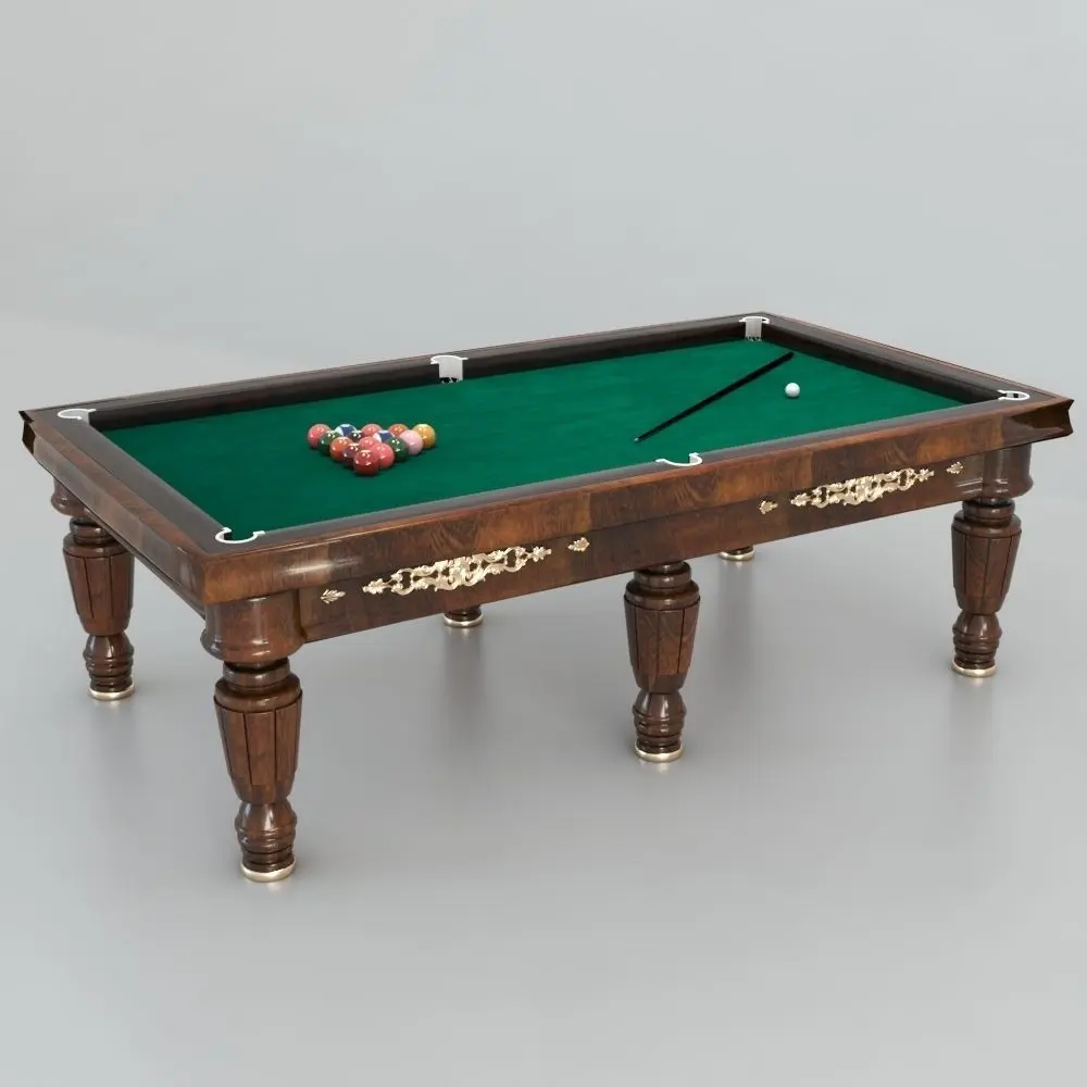 Classic billiard table with golden carvings and glossy dark wood along with billiard and billiard balls.