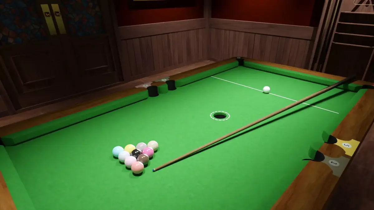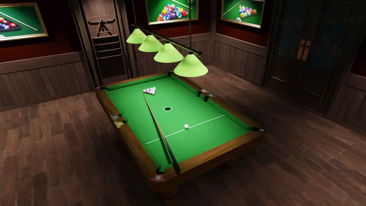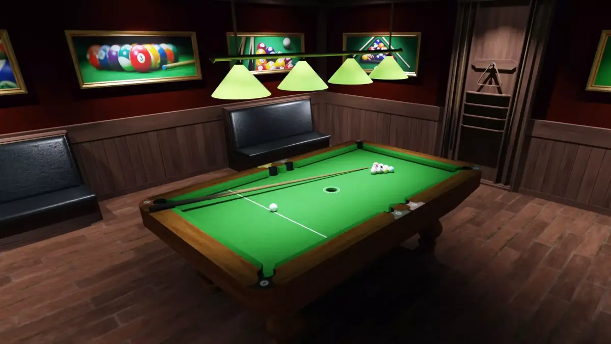 This environment includes a detailed pool table setup with a fully designed interior space featuring wooden walls, decorative props, lighting fixtures, and optimized assets ready for real-time engines.