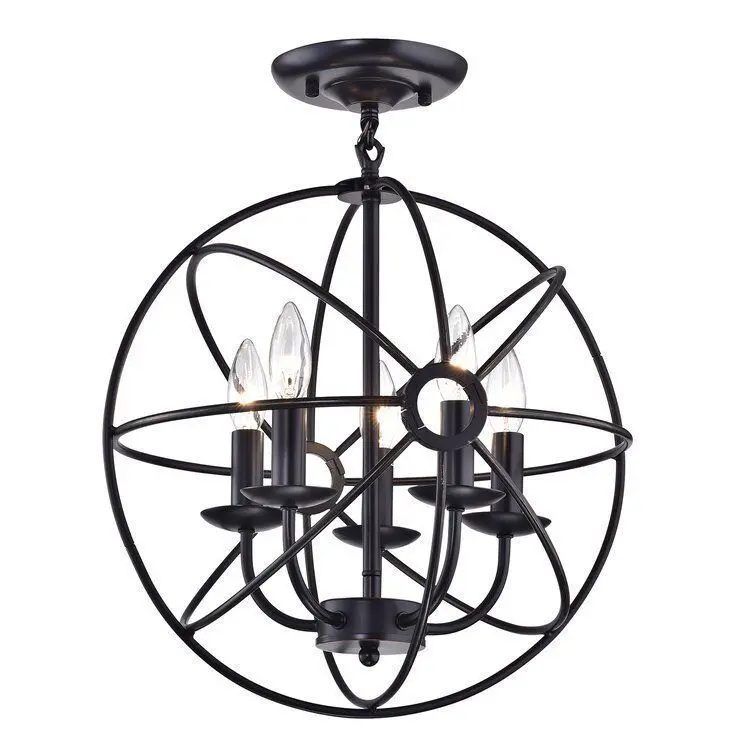 - This semi-flush mount features 5 candelabra style lights encased in an oil-rubbed bronze globe style cage. The 5 lights cast a glow of light in the room that is slight yet powerful and adds a touch of mood lighting and drama to any room you place it in