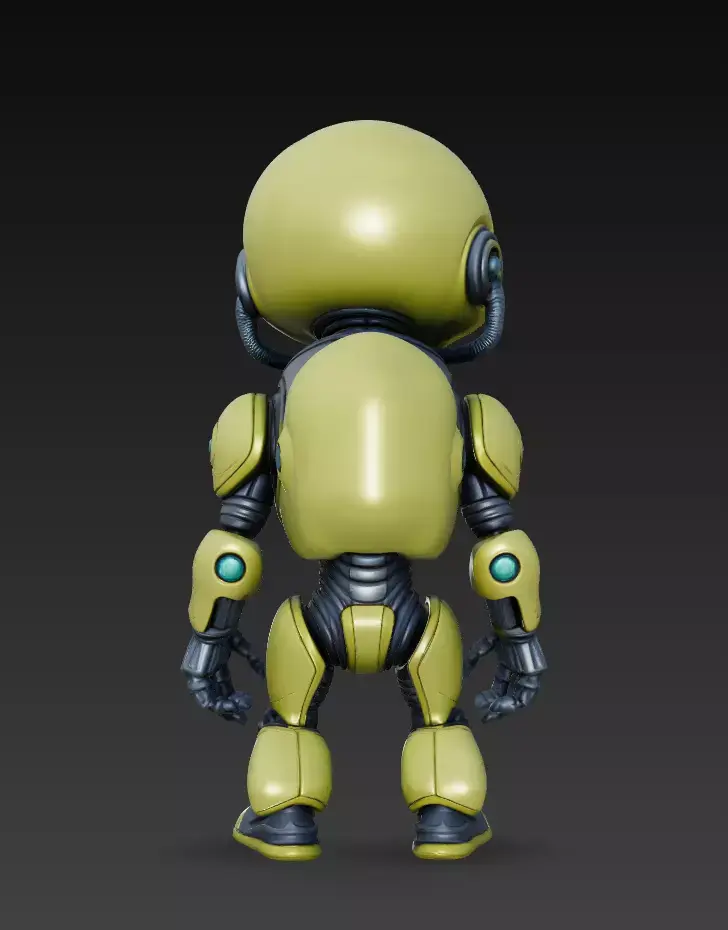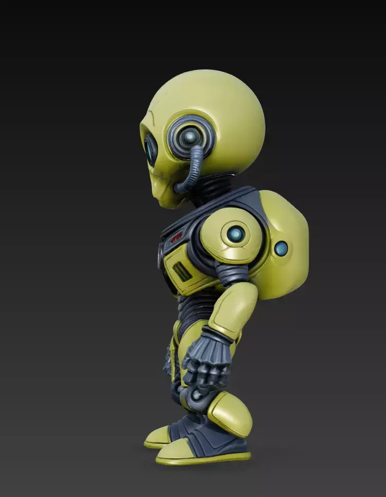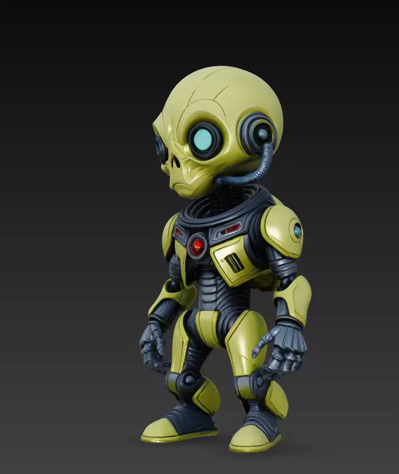 Designed with a skeletal alien face, glowing cyan eyes, reinforced torso plating, and flexible mechanical joints, this model brings personality and high-tech aesthetics together.Its compact proportions and clean stylized shapes make it ideal for both digital rendering and 3D printing.