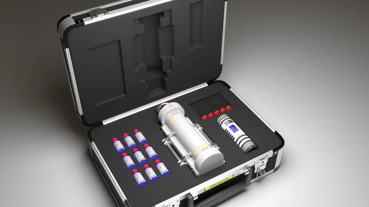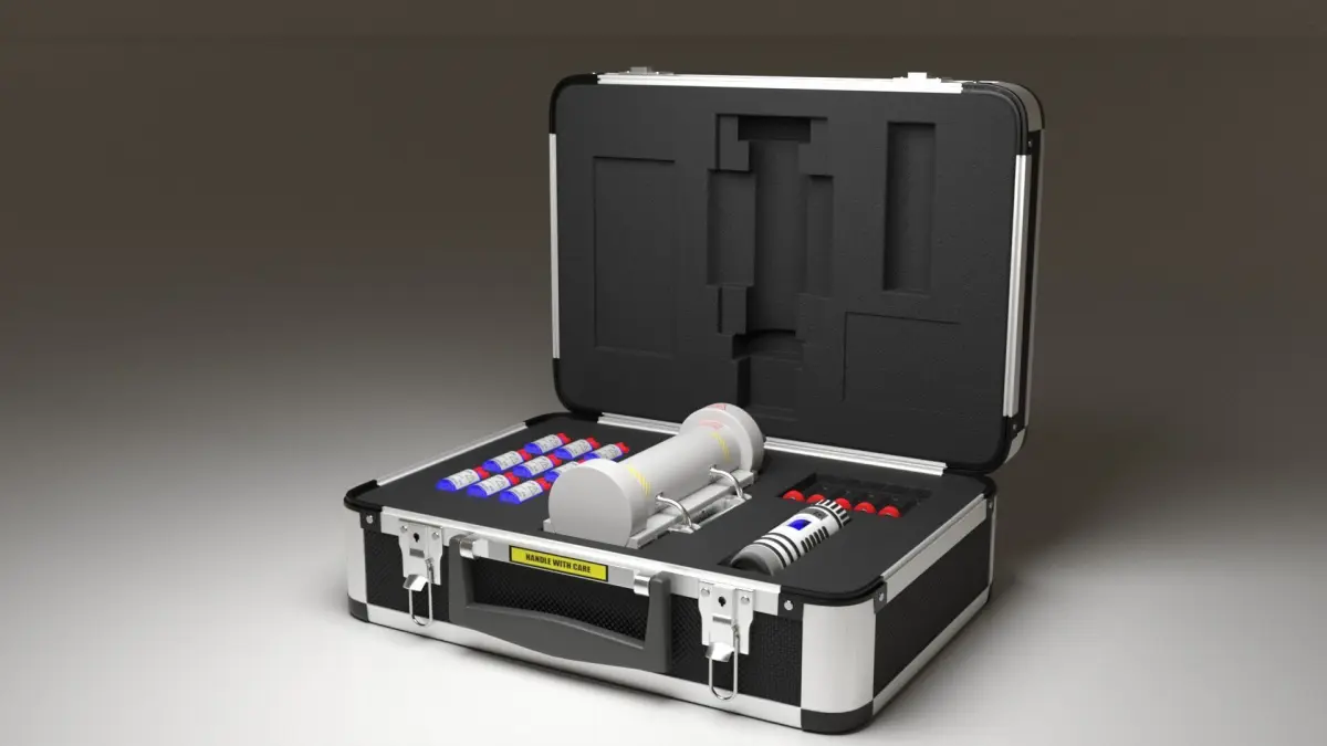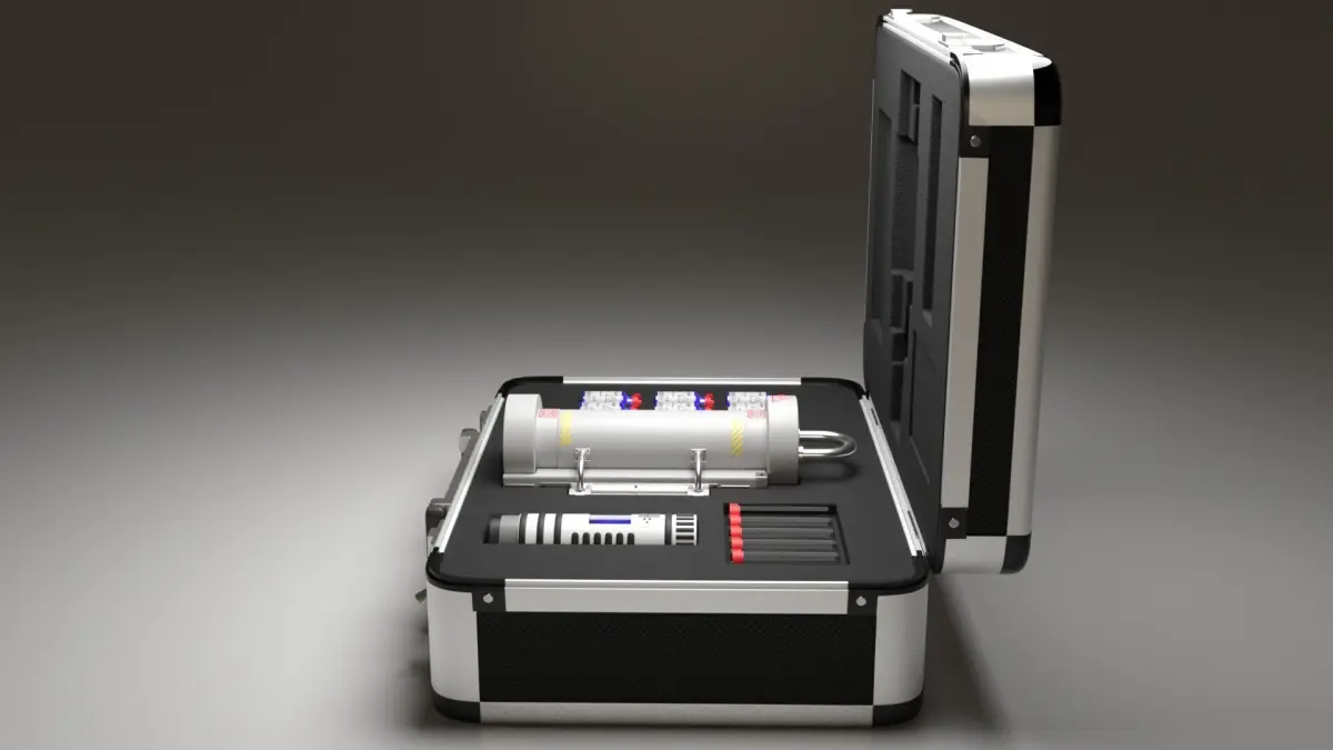 Features:Dimensions of the briefcase are 350mm x 260mm x 120mmObjects in a briefcase are:• Bottles with antivirus liquid• Empty ampoules• Container for virus transportation• Syringe device with filled ampoule