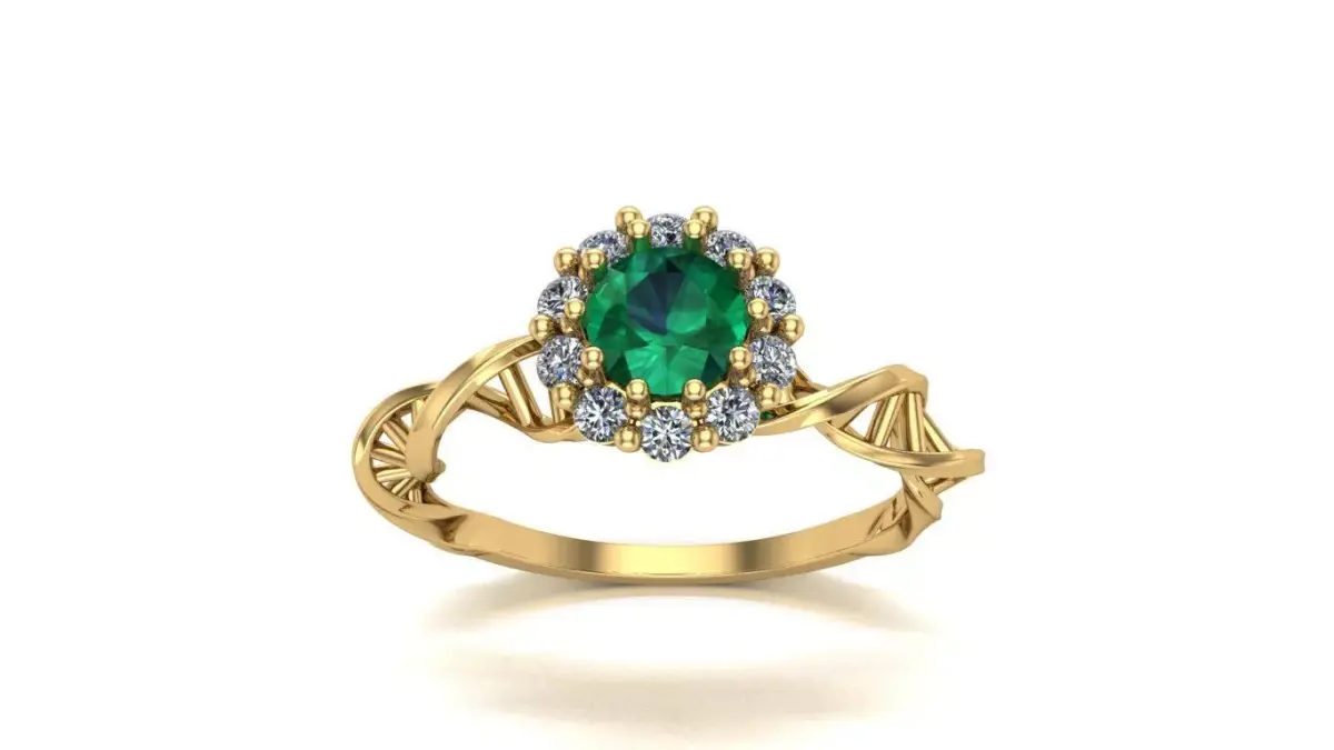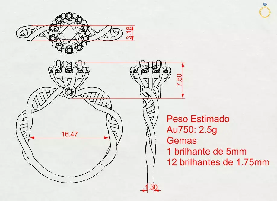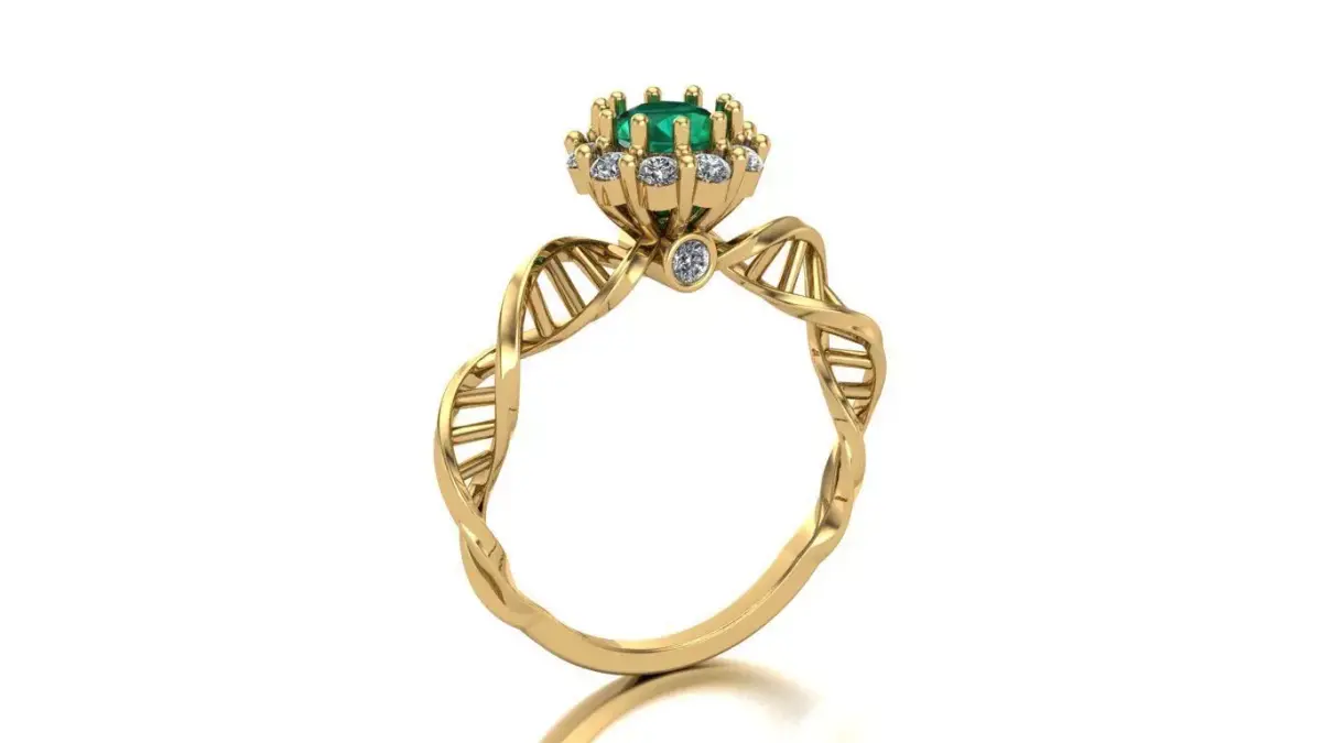 This ring pays tribute to Biomedical ScienceRing inspired by the DNA double-helix structure, symbolizing the union between science and life. It features a central 5 mm gemstone surrounded by 12 smaller stones of 1.75 mm, creating an elegant crown-like design. A round accent stone below the head completes the anatomical aesthetic.Estimated weight: 2.5 g (Au750).All measurements of the piece are shown in the image in millimeters.Includes a file containing the model in multiple ring sizes, in addition to the one shown in the images.Poesie