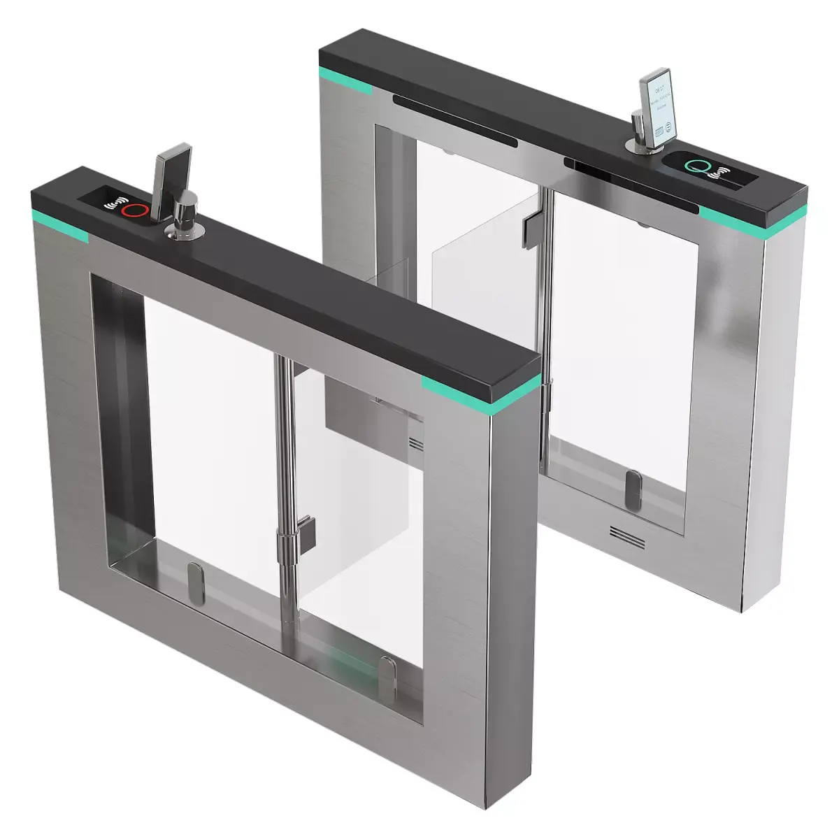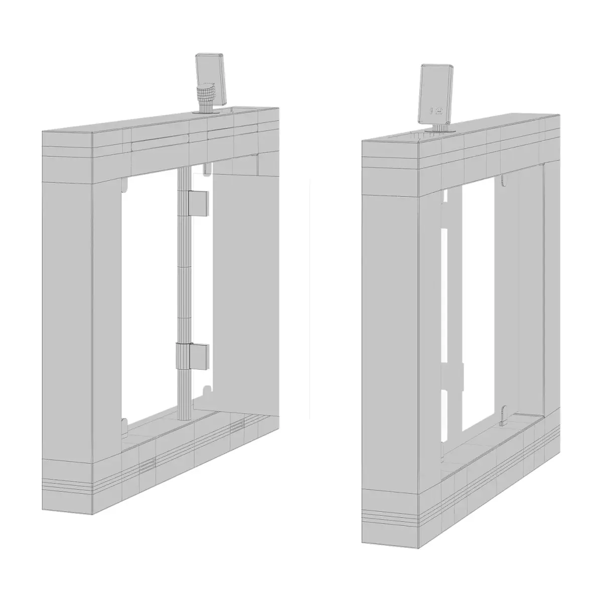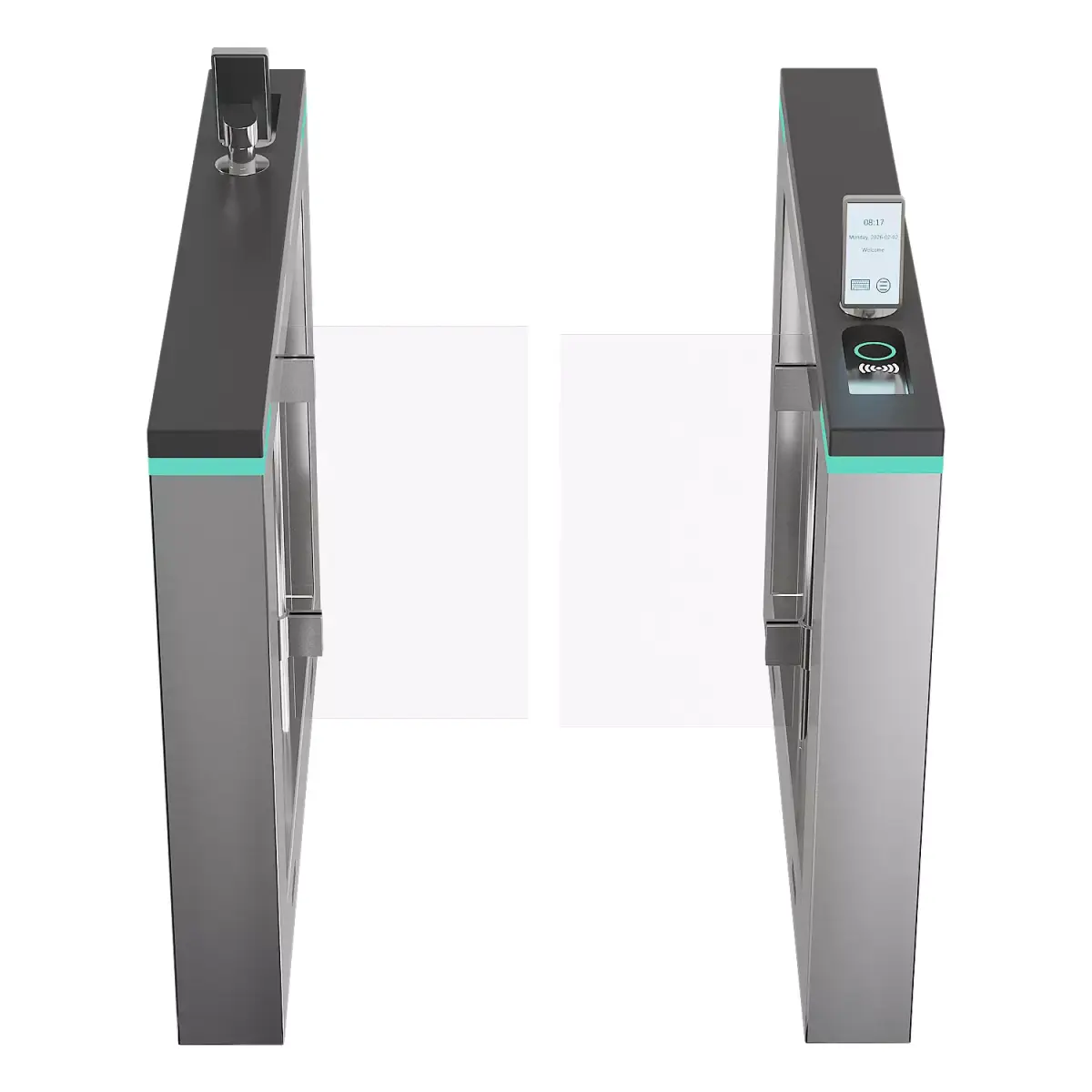 A speed turnstile with hybrid biometric identification. It consists of two end sections with hinged acrylic doors and two SpeedFace-V4L Pro-RFID [EM] facial recognition terminals with brackets for installation on the turnstile. This kit is designed for access control and time and attendance monitoring for a single access point in both directions.