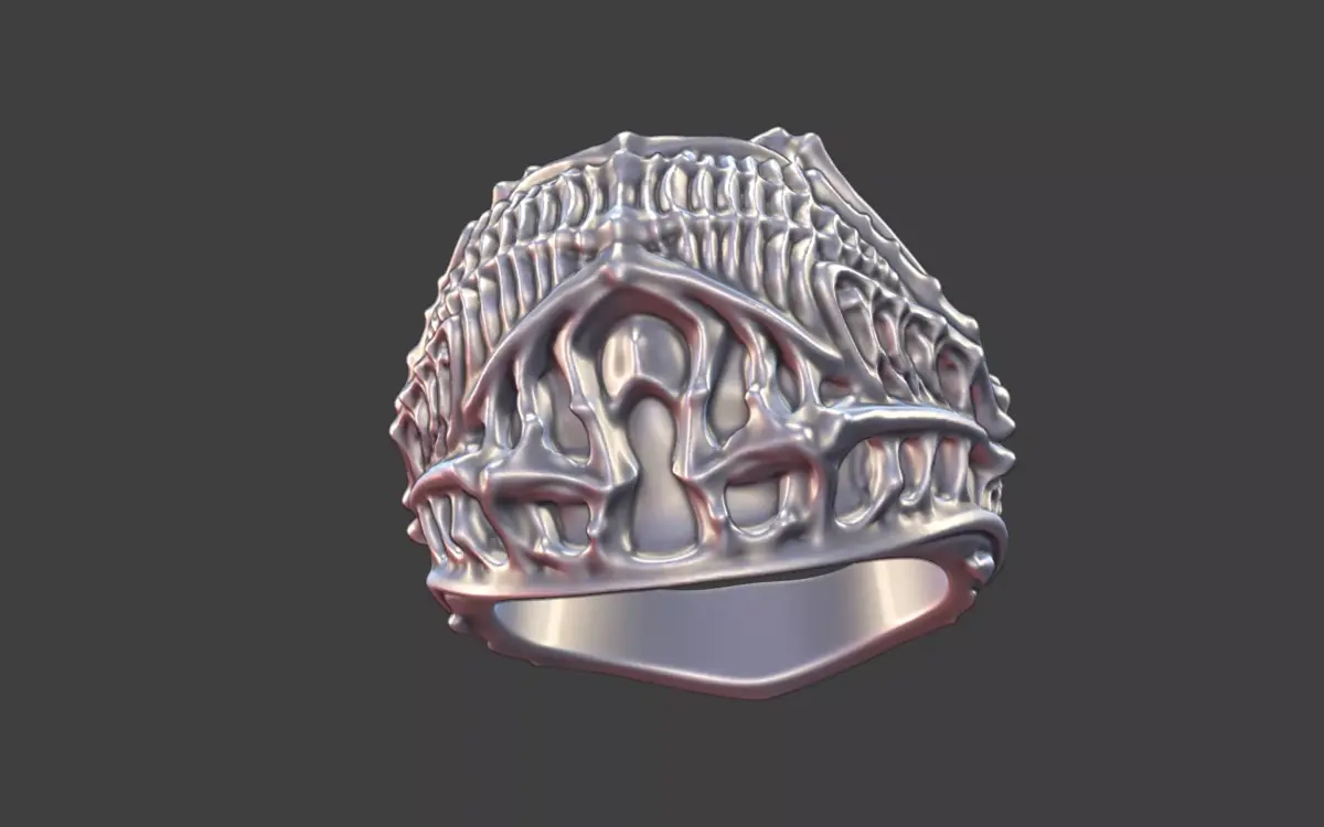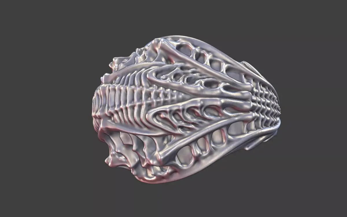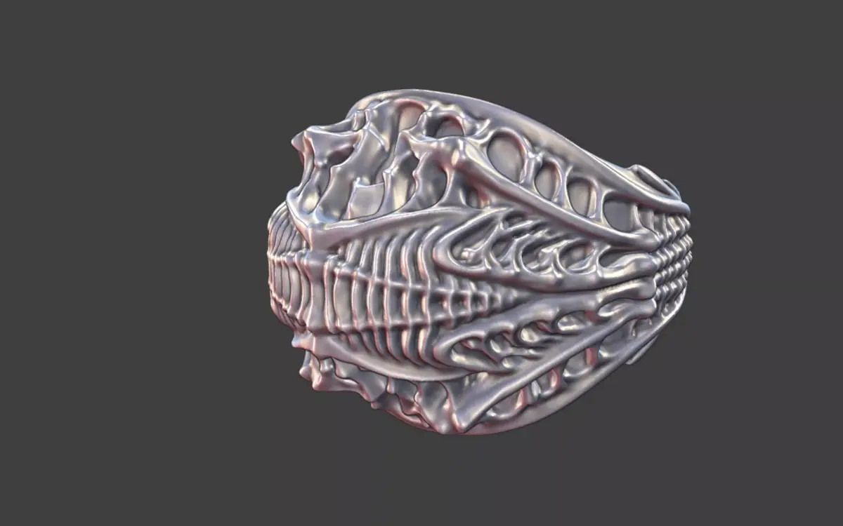 An intricate bioorganic ring inspired by the dark, surreal worlds of H.R. Giger, blending organic anatomy with mechanical precision. The design features flowing skeletal structures, ribbed textures, and fluid curves, merging into a seamless, alien-like form. The 22 mm inner diameter makes it ideal for larger ring sizes, while its compact height and ergonomic design ensure comfortable wear. Every ridge and contour is sculpted to cast dramatic shadows, emphasizing the piece’s biomechanical elegance.