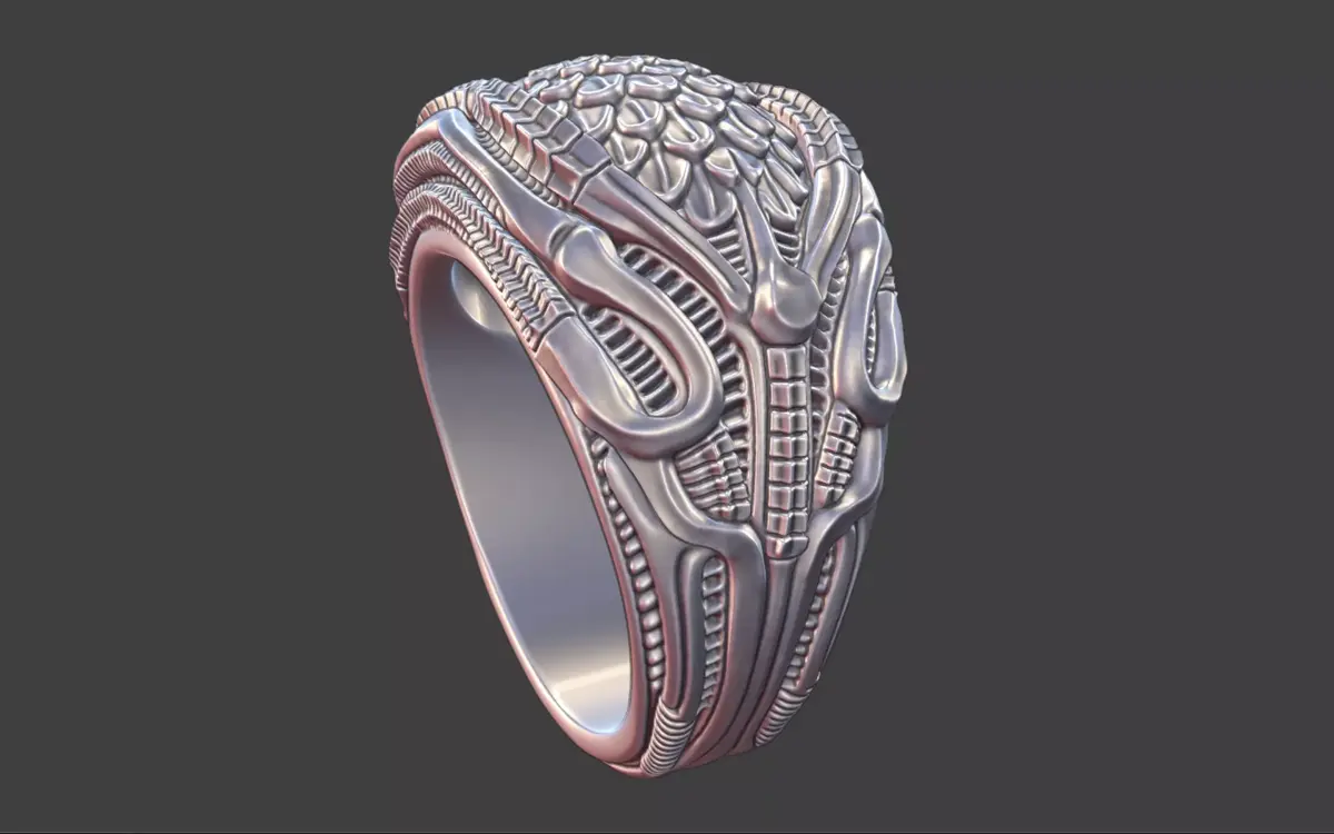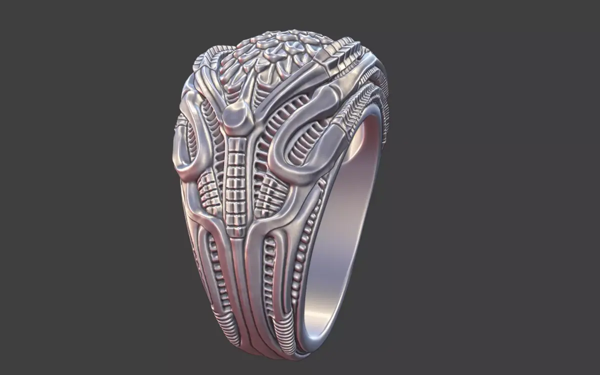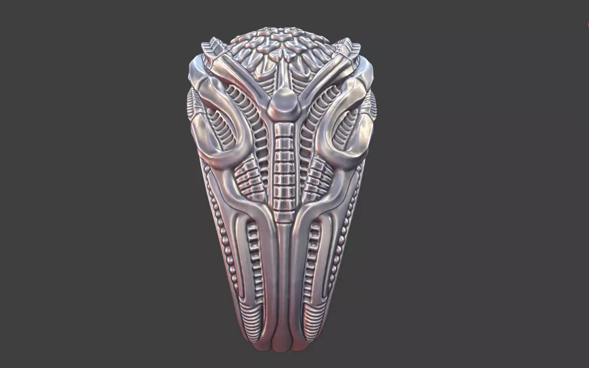 An intricate bioorganic ring inspired by the dark, surreal worlds of H.R. Giger, blending organic anatomy with mechanical precision. The design features flowing skeletal structures, ribbed textures, and fluid curves, merging into a seamless, alien-like form. The 22 mm inner diameter makes it ideal for larger ring sizes, while its compact height and ergonomic design ensure comfortable wear. Every ridge and contour is sculpted to cast dramatic shadows, emphasizing the piece’s biomechanical elegance.