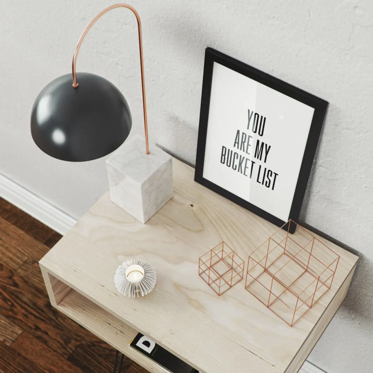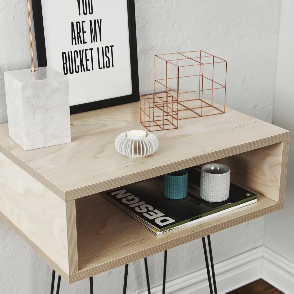 Birch Playwood Nightstand with accessories (1x Nightstand, 1x lamp, 1x picture frame, 2x decor cubes, 1x candle, 2x magazine, 2x little vase)