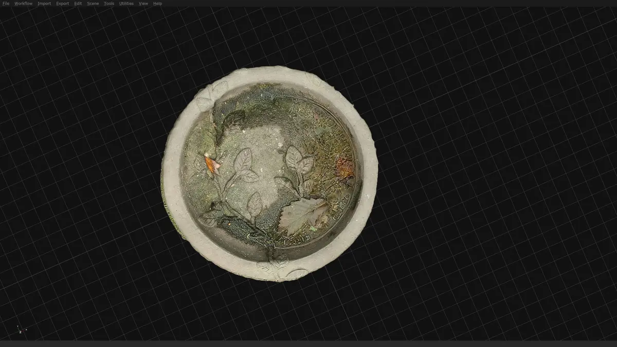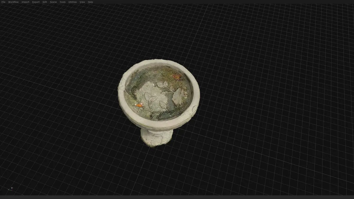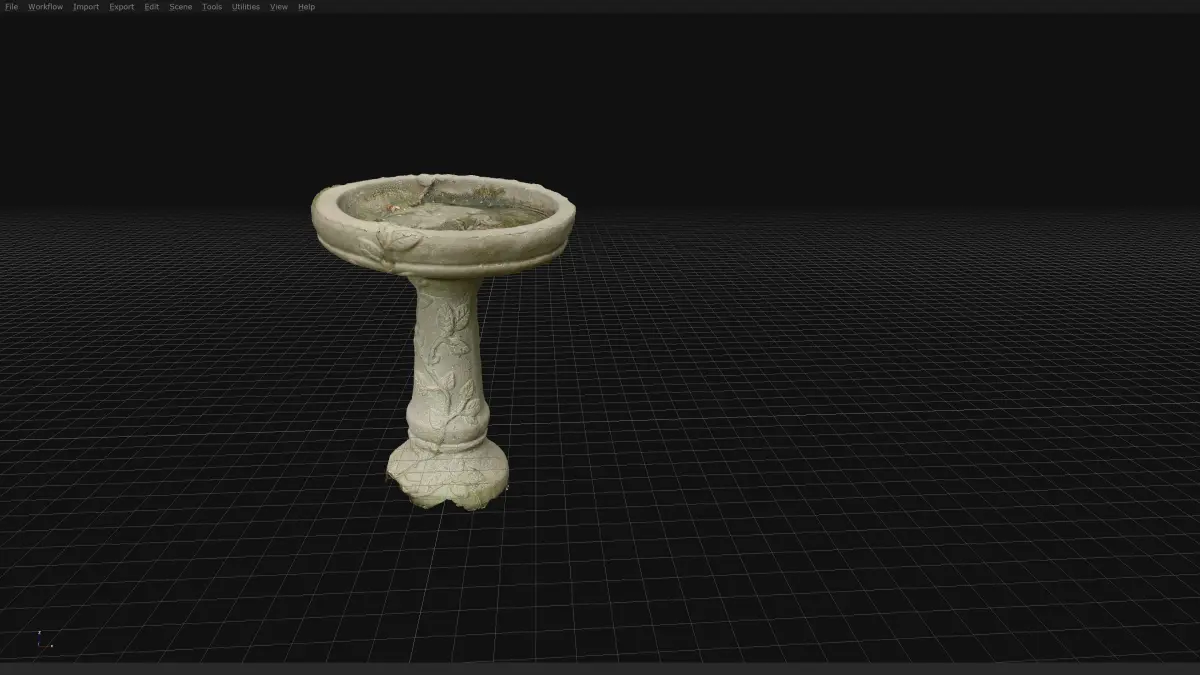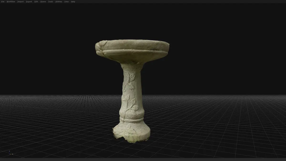 Used bird bath. Leaf details in bowl and on stand. This is made of stone. Good for garden scenes. Material has some leaves in the bowl. The model has some deformation on the base.