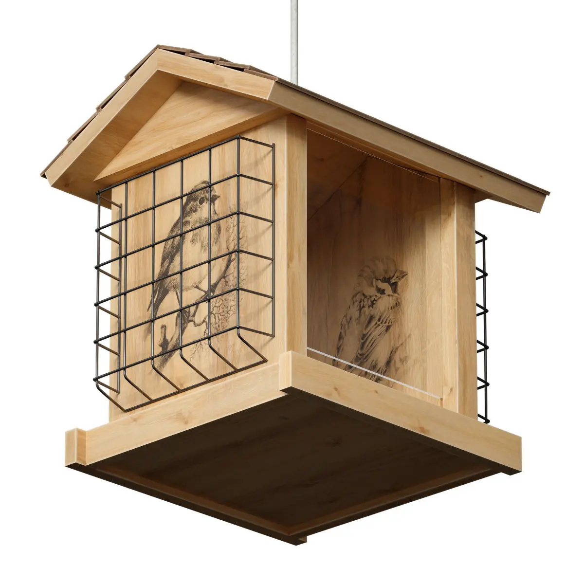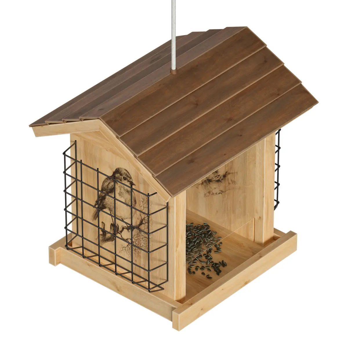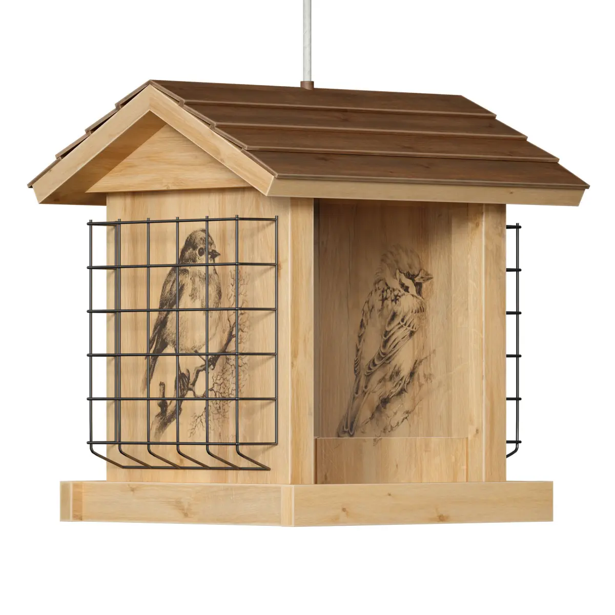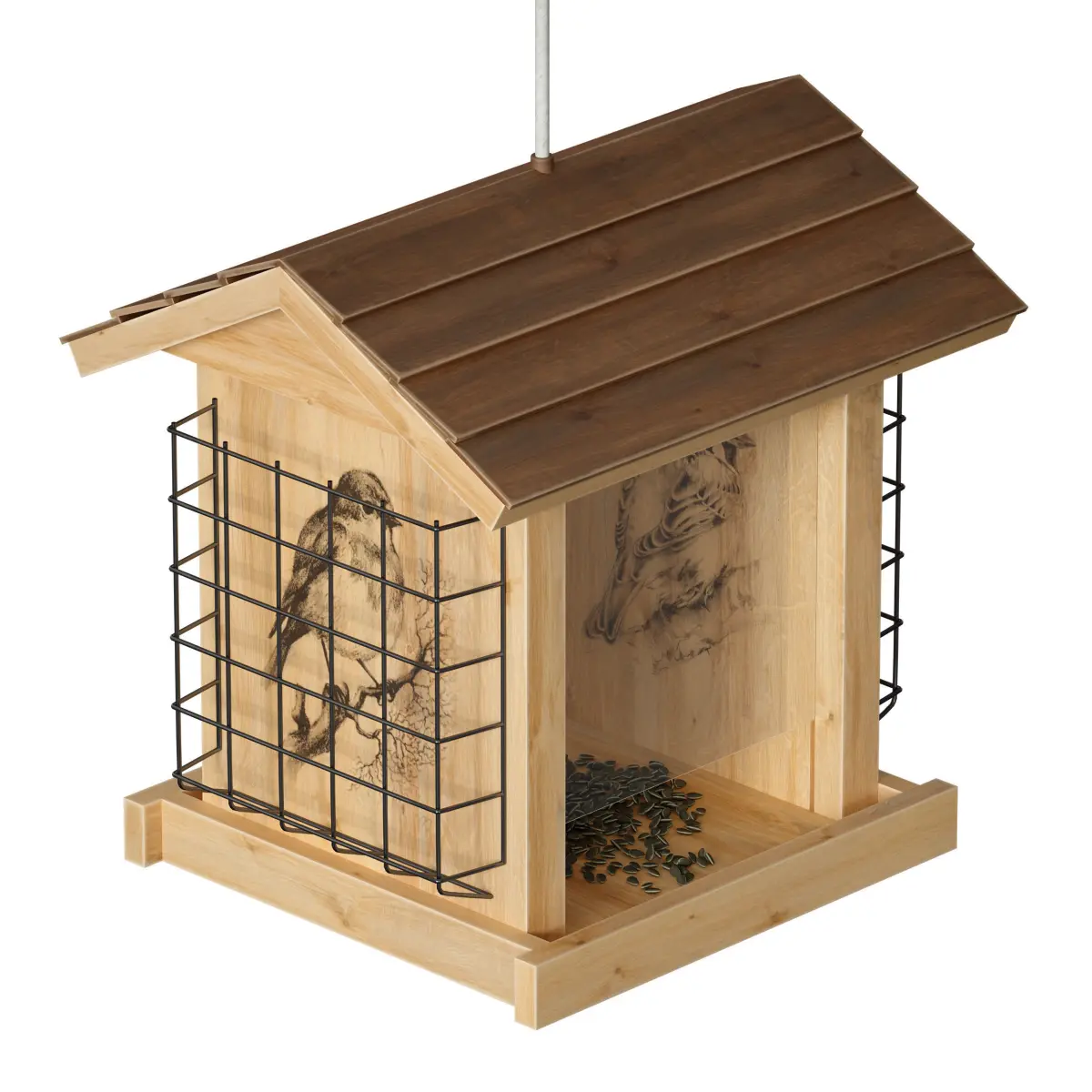 3D model of a bird feeder. Made of wood, metal and glass. The feeder is made in the form of a house with a roof, with metal bars on the sides to accommodate large feed. The side walls are made of glass and provide protection from the wind. Seeds are sprinkled inside the feeder as food. There are drawings of birds on the side walls of the feeder. The design of the feeder is made with elements of oriental Japanese style. The feeder can be used suspended, or it can simply be installed in an open place, for example on a windowsill or table.