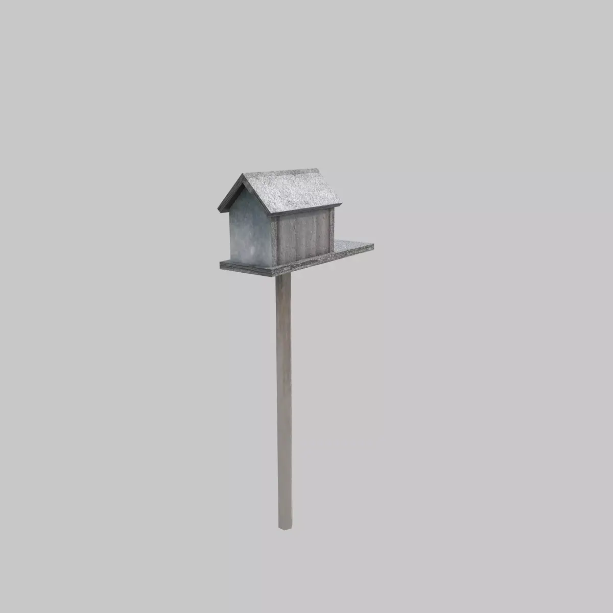 Classic birdhouse design with roof, platform, and post