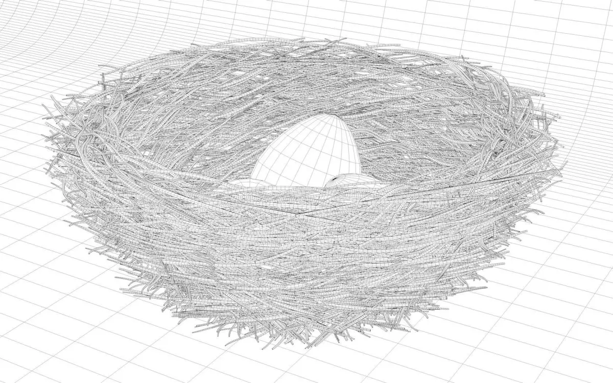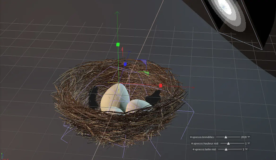High detailled bird's nest made with mograph. This model may be controled by an xpresso panel : modify height, width and number of branches.