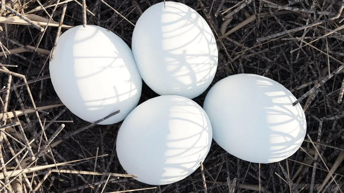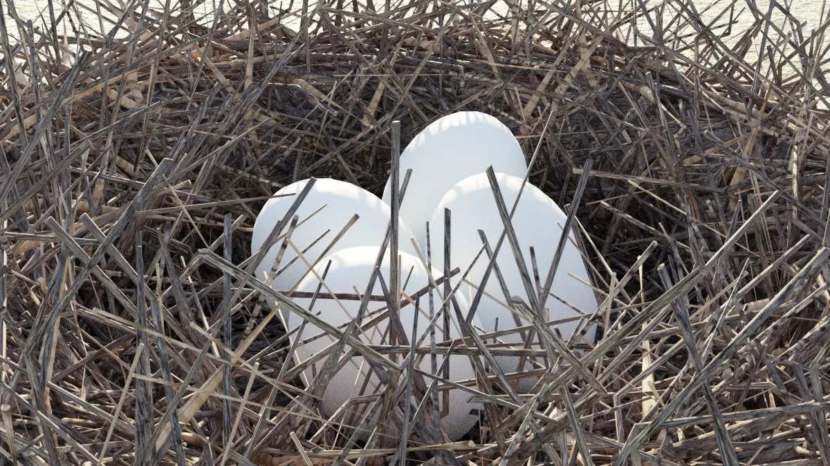 This is a bird's nest model. The scene has the nest, 4 eggs and the grass background as seen in the images.