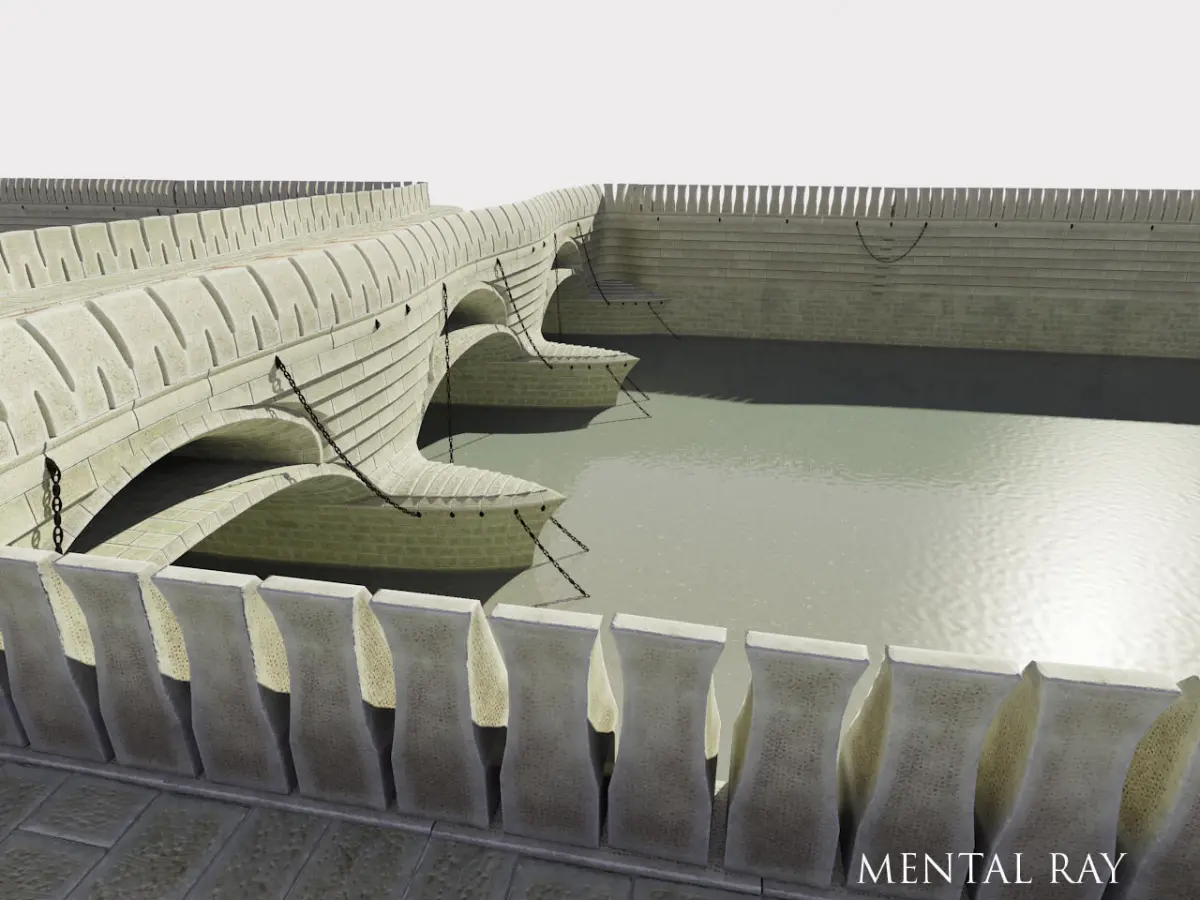 A neoclassical bridge with riversides. Tileable both along river length and river width with logically built elements. Without chains the face count is 152139 and vertex count 81118.