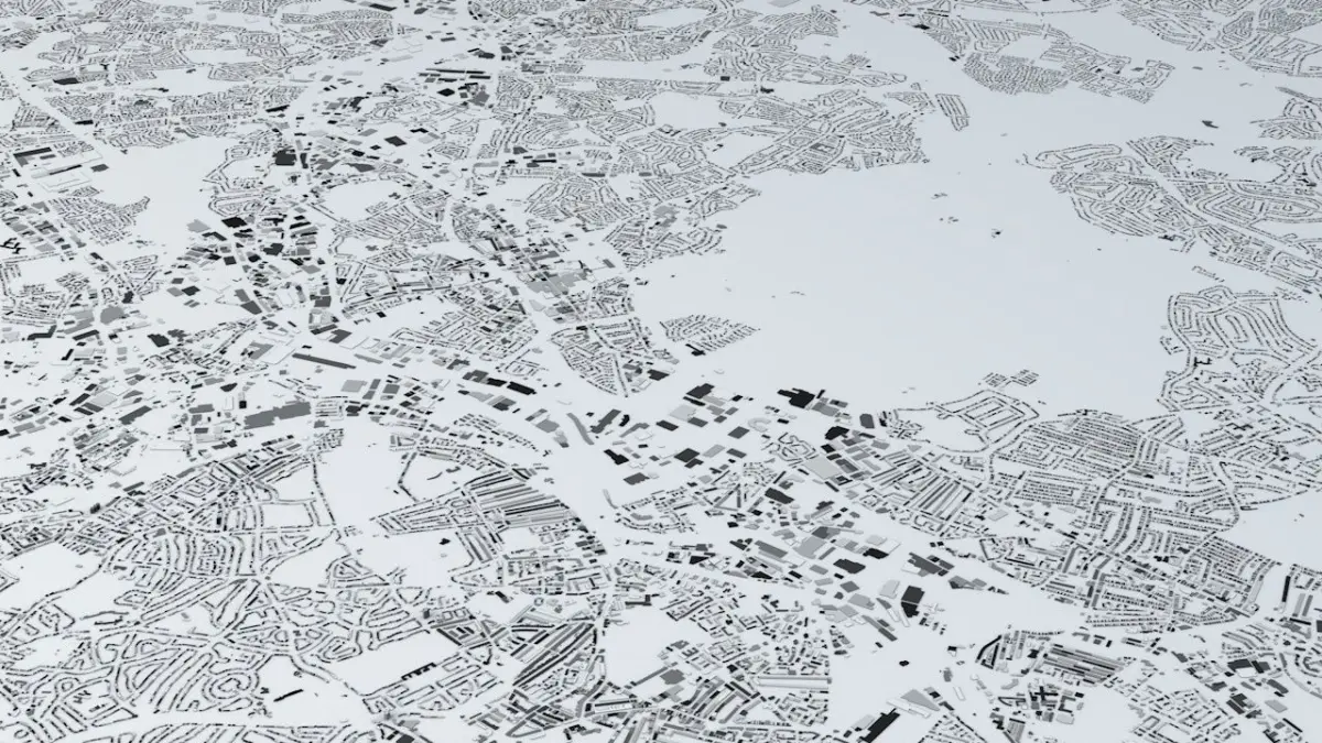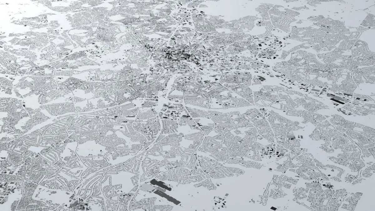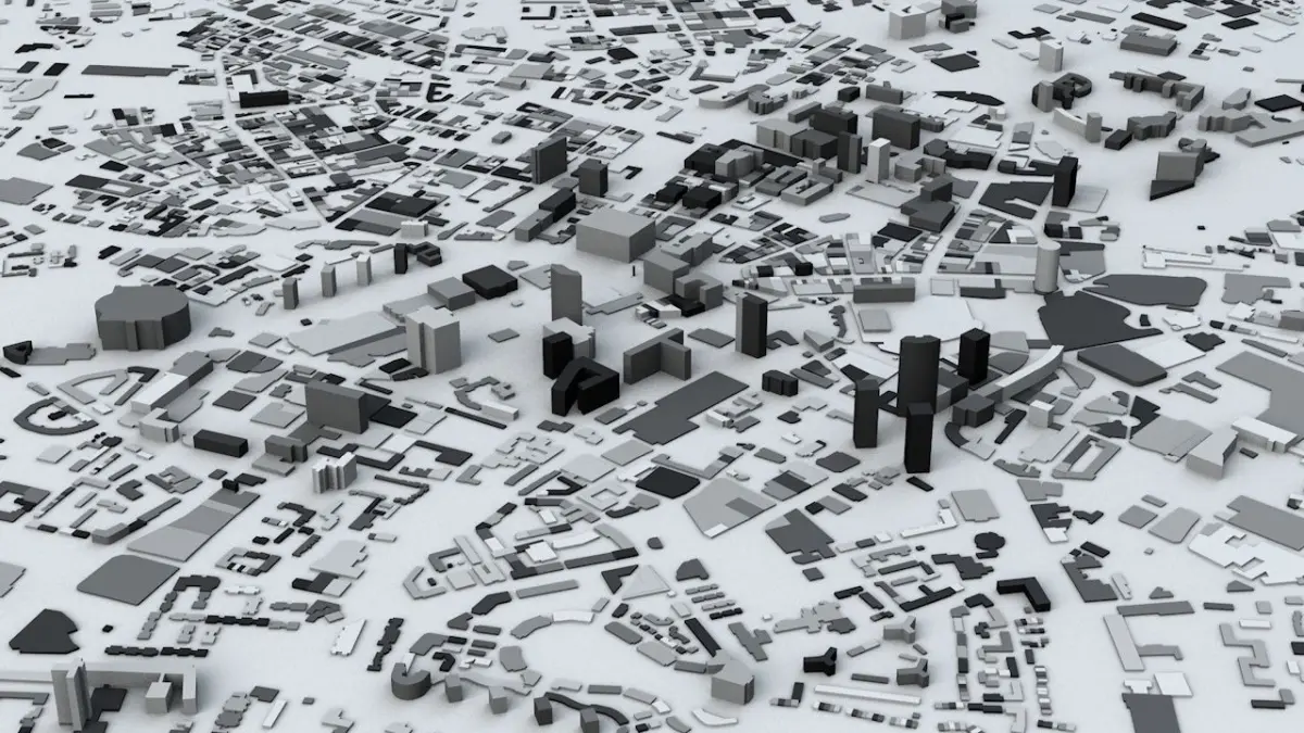 - the model is positioned on a flat surface (all buildings are on the “floor” - no elevation data included)