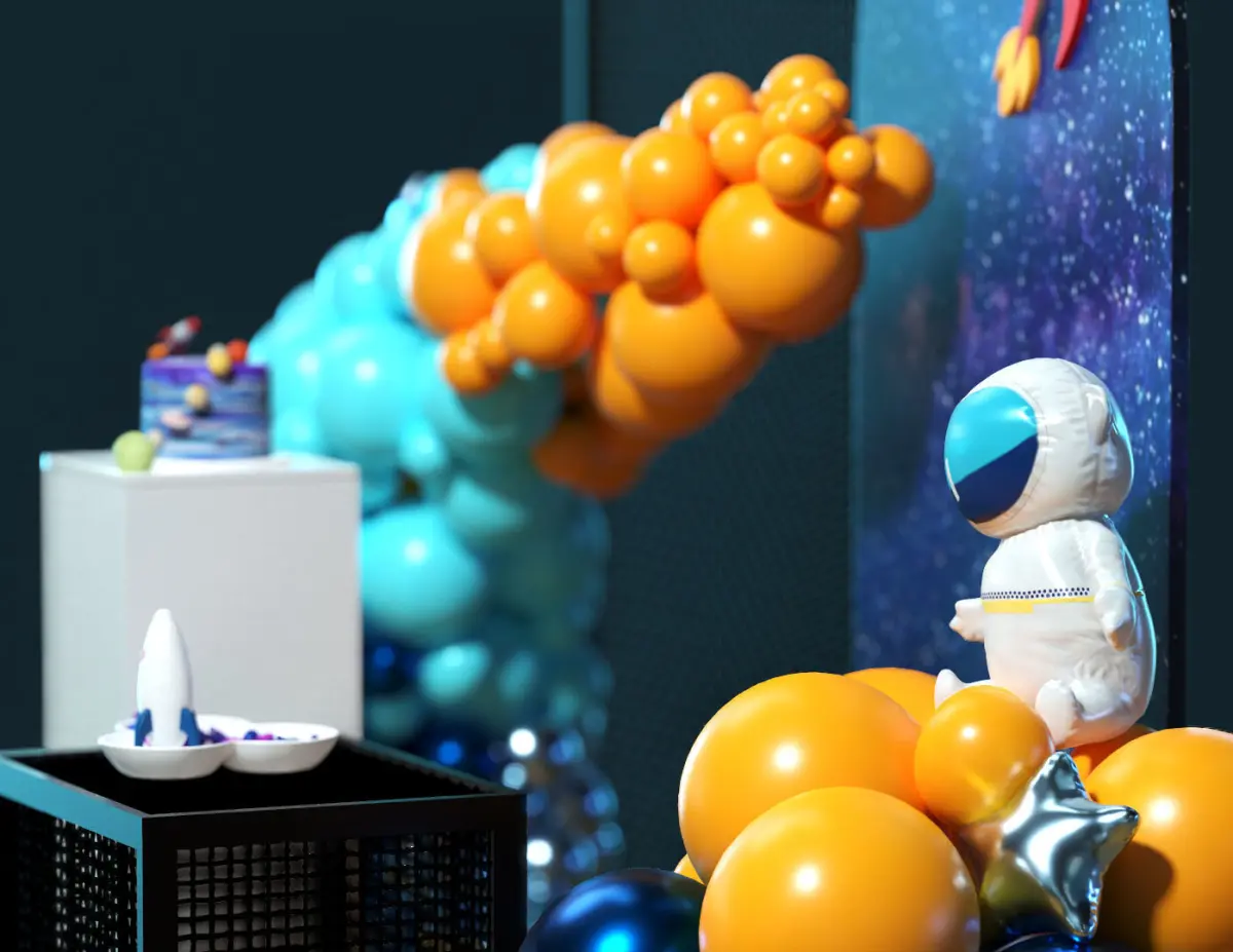 A set design for Birthday **party inspired by **space **and **astronomical **elements. It contains 3ds max file with two setup for Vray and Corona and Obj-DXF file with a texture folder of all objects. -You can find Birthday **Cake, Baloons, **Stands **and **spaceship **model here in the scene and use theme separately. -4 different themes will be added.