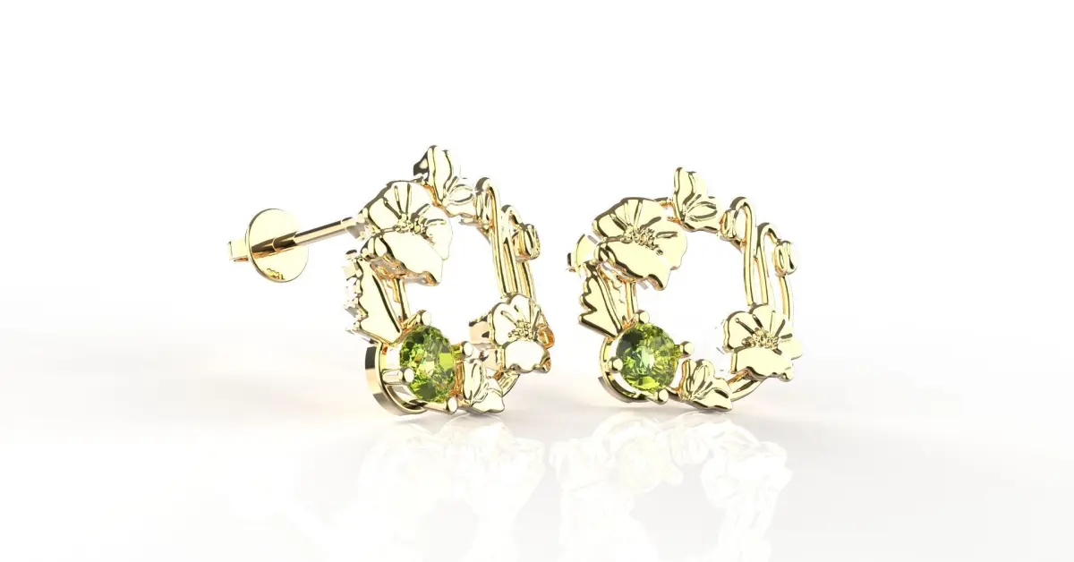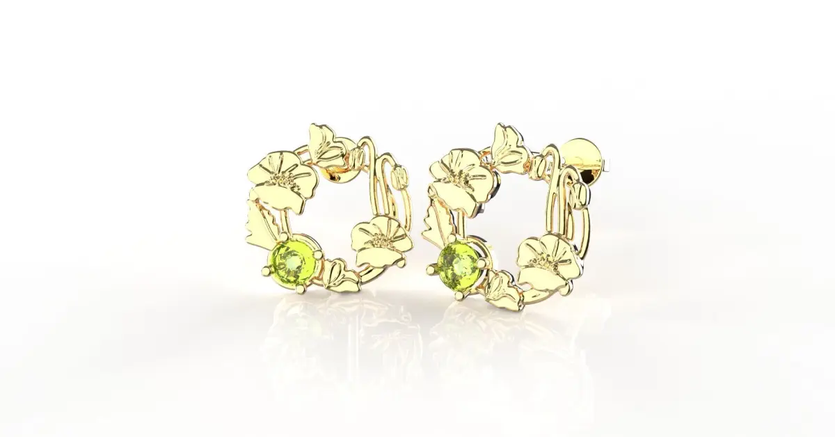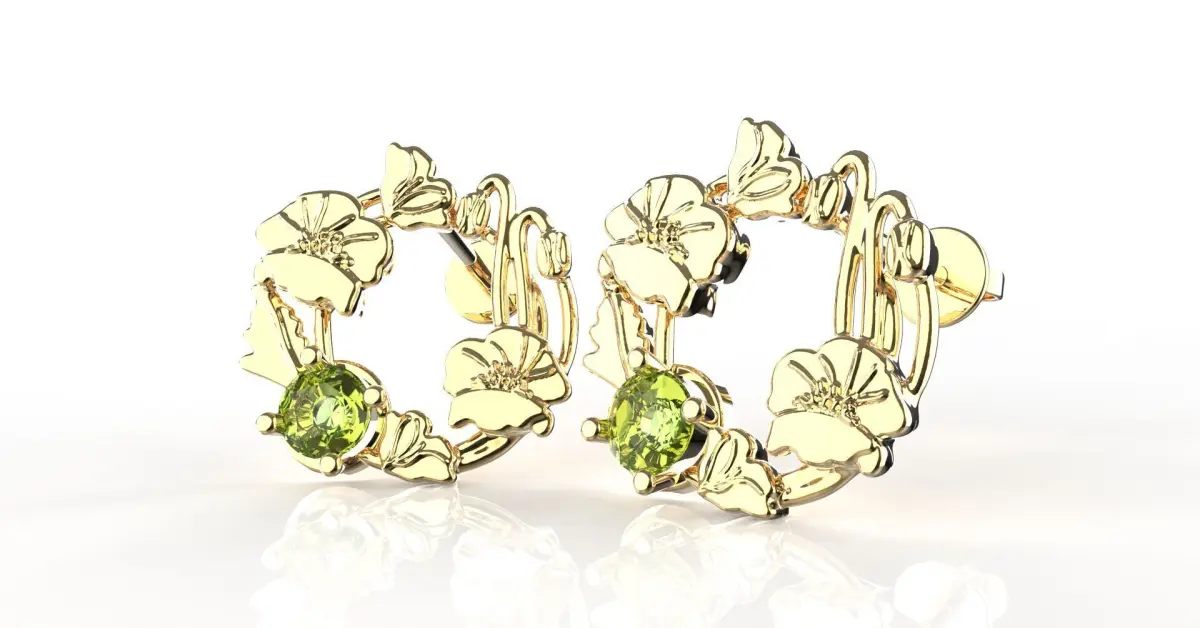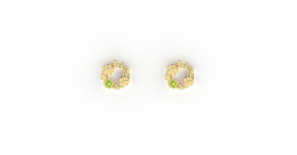 Simple, and solid stud earring with beautifully arranged August's birth-flower 'Poppy' into a flower wreath inspired design. With diameter approximately 15 mm, this dainty earring purposely curated for daily and casual wear while maintaining its signature elegance. Finished product preferably to be adorned with peridot or light green cubic zirconia stone -- as August's birth stone.