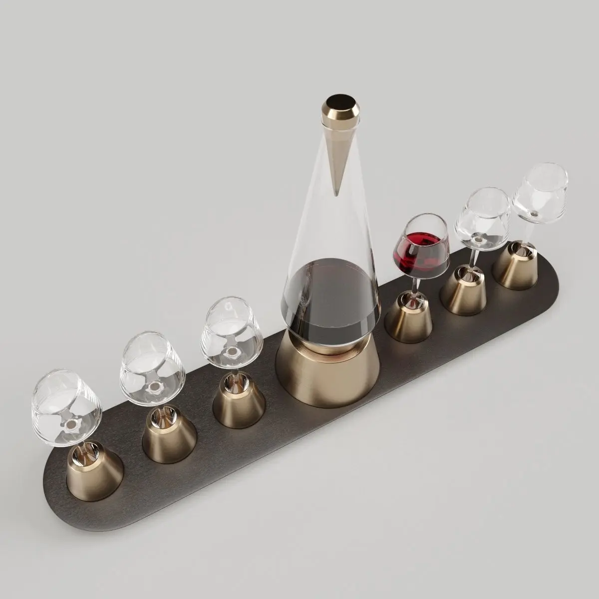 Influenced by and named after the classic tale of the ‘Bishop of Norwich’, a nineteenth-century gentleman notorious for forgetting to pass the port. This set brings about the return of humble rituals from the past through a drink that has become quintessentially British.With respect to the tradition, the ‘Bishop of Norwich’ has been specifically designed to encourage the user to drink their port and pass the decanter. Due to their elaborate design the port glasses and decanter cannot be put down on the table unless placed within their individual brass bases, hence the port is continuously passed, shared and quaffed.An elongated wooden tray brings all the parts together, making the complete creation a grand central piece. The ebony finish creates a striking contrast with the brushed sheen of the brass and a distinctive sculptural form appears when all the elements are displayed alongside one another. ‘Bishop of Norwich’ is part of the permanent museum collection of Shanghai Museum of Glass.