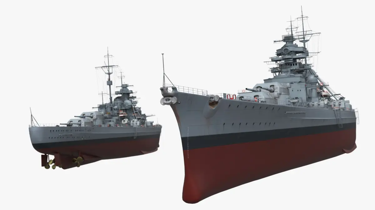 Bismarck 1940 Sea Trials Configuration Battleship Gray Rigged for Cinema 4D is a three-dimensional model of the legendary German battleship as it appeared during its initial sea trials in 1940, complete with historically accurate detailing and rigging.