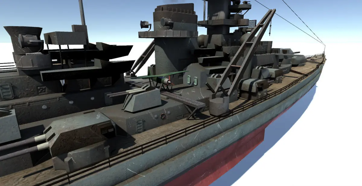 Bismarck battleship lowpoly game model with 4096x4096 PBR textures. All parts propeller, airplane, rudder and all turrets and guns separated models for animation. In the Unity package available a realistic smoke also.