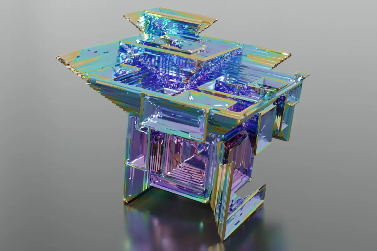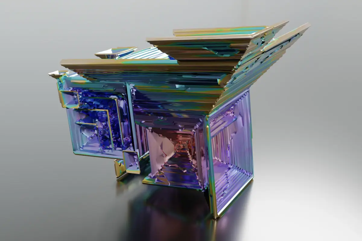 6 types of bismuth crystal growths modeled after laboratory grown crystals. Metal colors set to resemble Bismuth(III) Oxide thin films developed when cooling in air. Thin film interference is the fenomenon that gives the oxide layer its distinct color banding.
