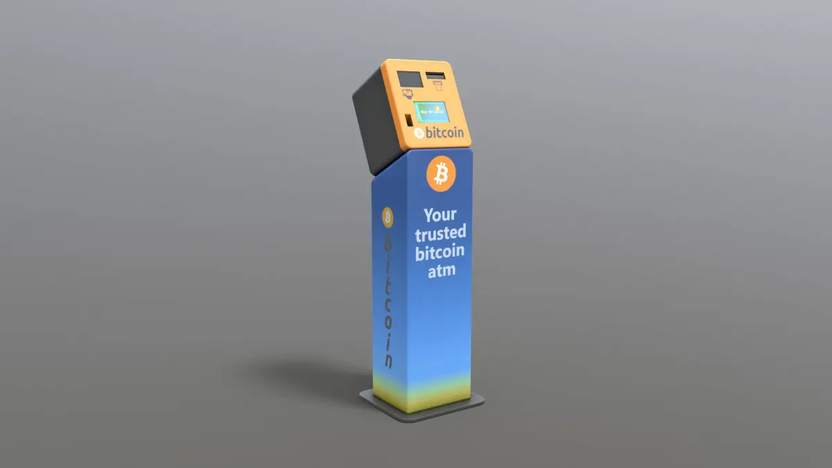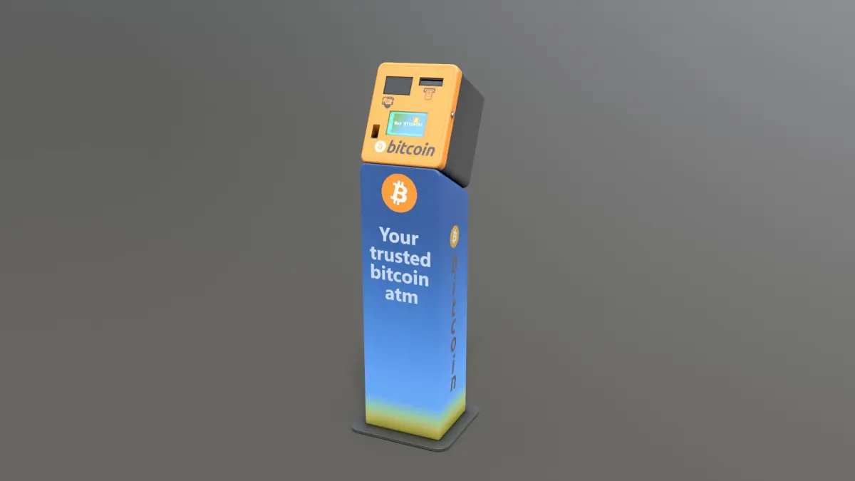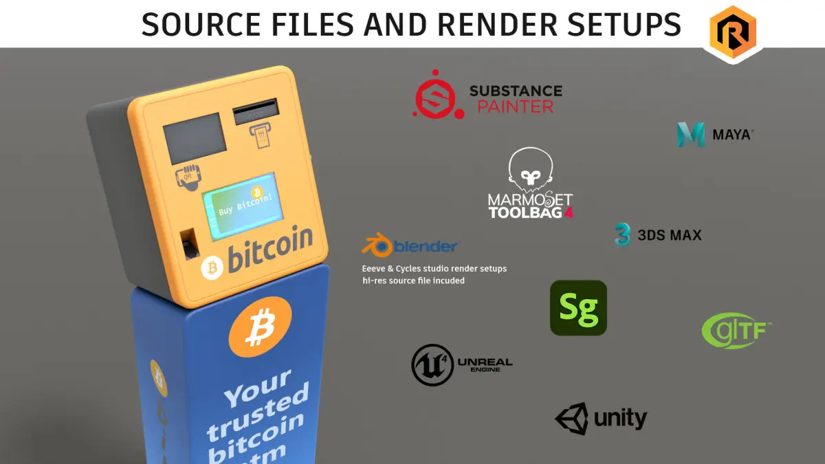 High-quality PBR low-poly 3D model of Bitcoin ATM kiosk. The model is one mesh with 3 PBS texture sets assigned.