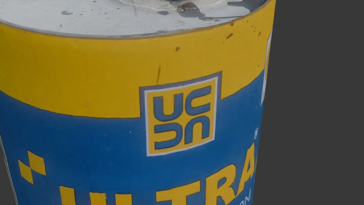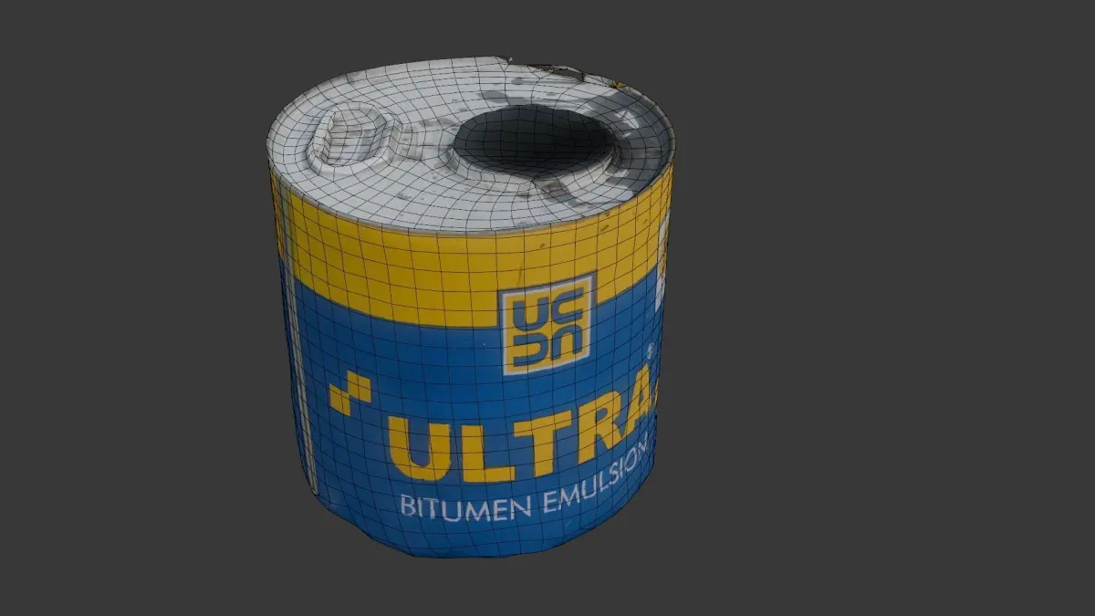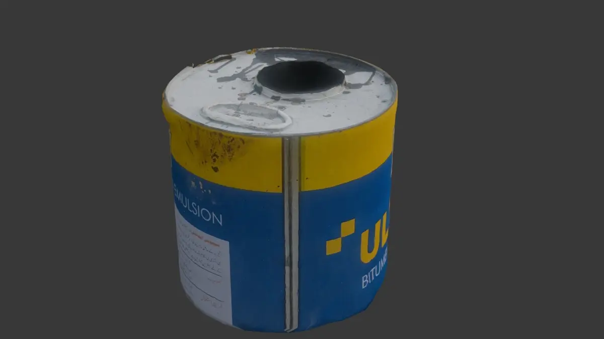 Highly detailed 3D scan of a used bitumen emulsion drum, featuring realistic dents, scratches, and worn-out textures. This industrial asset is ideal for urban environments, construction site visualizations, game development, and CGI projects.