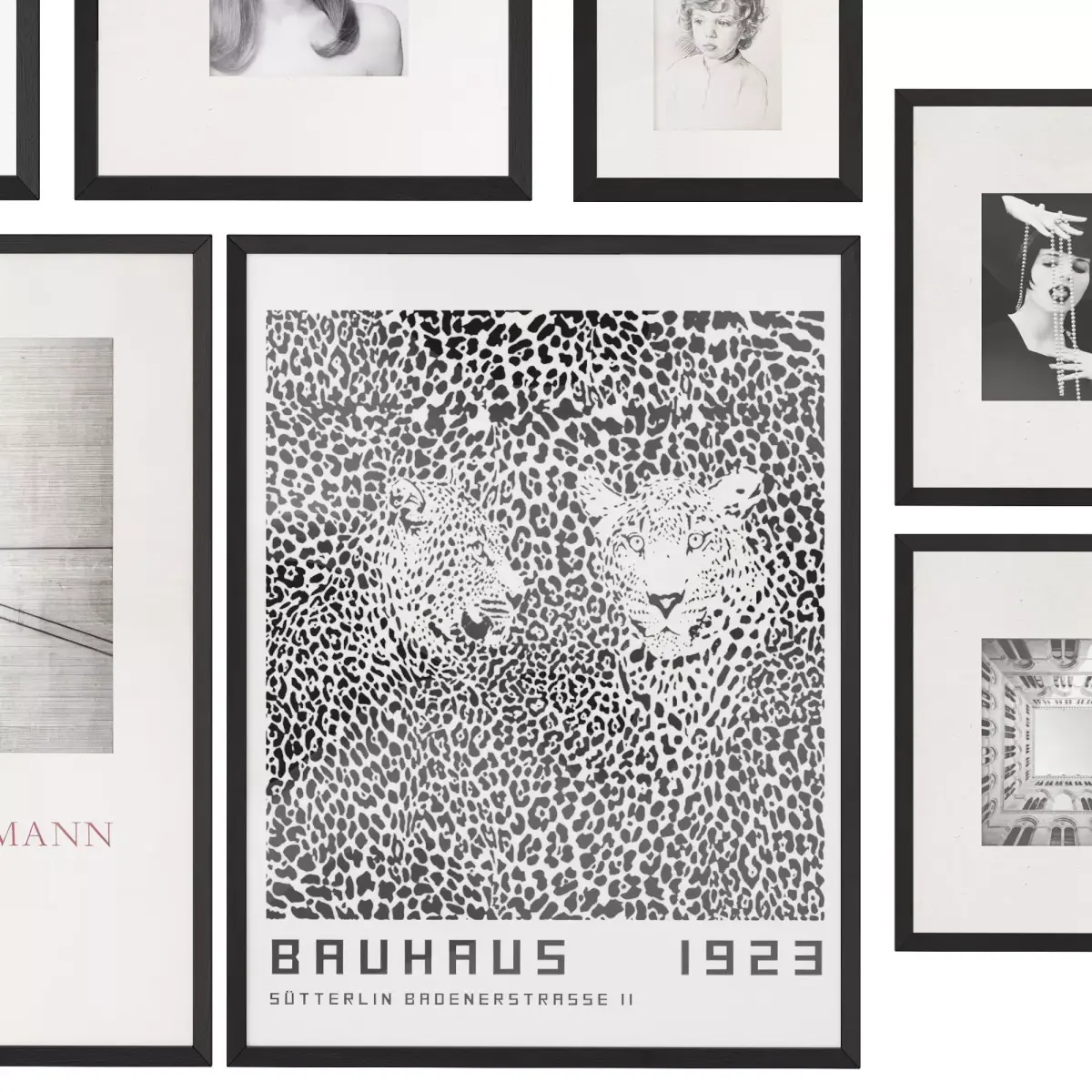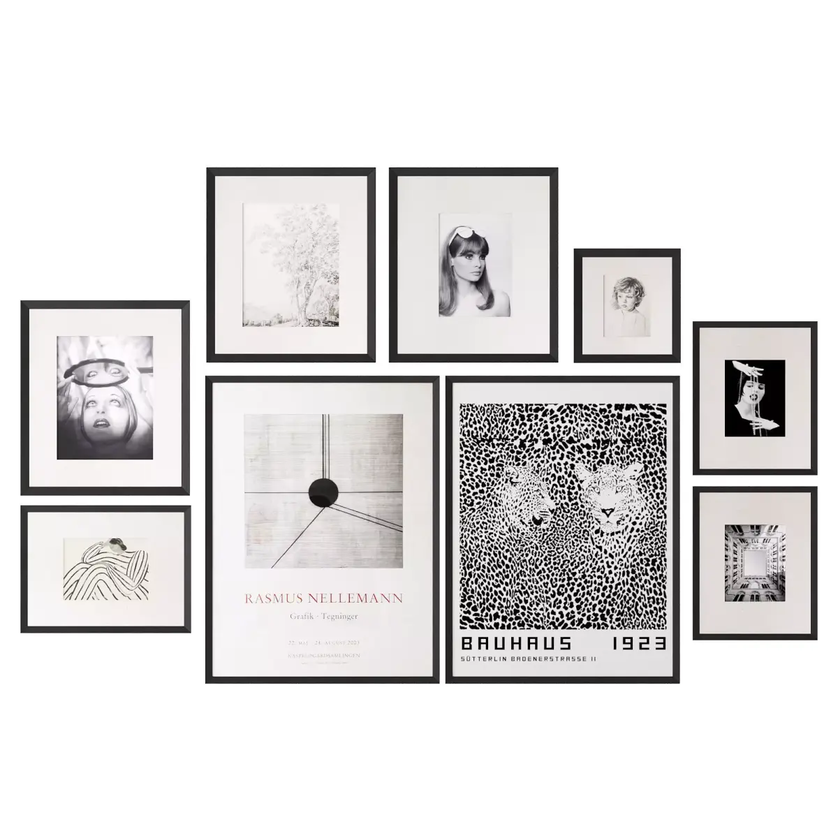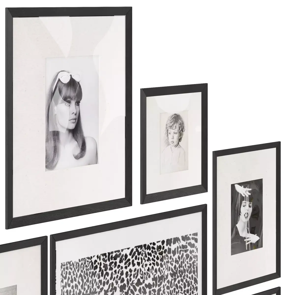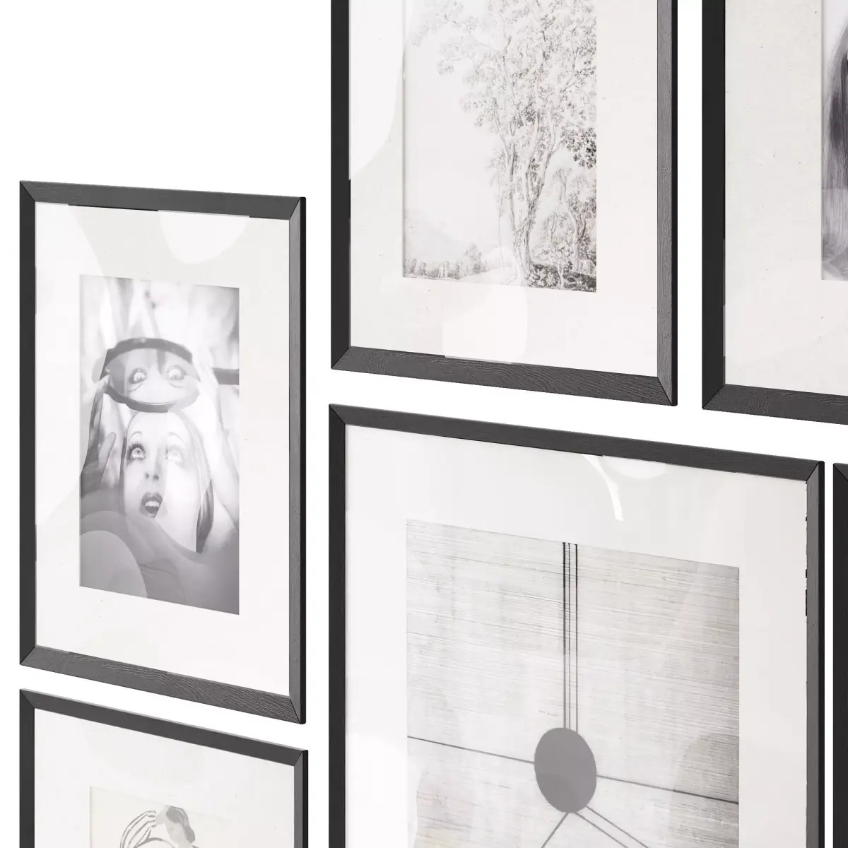 A set of black and white pictures, photos, posters, drawings in a black frame with a passe-partout.