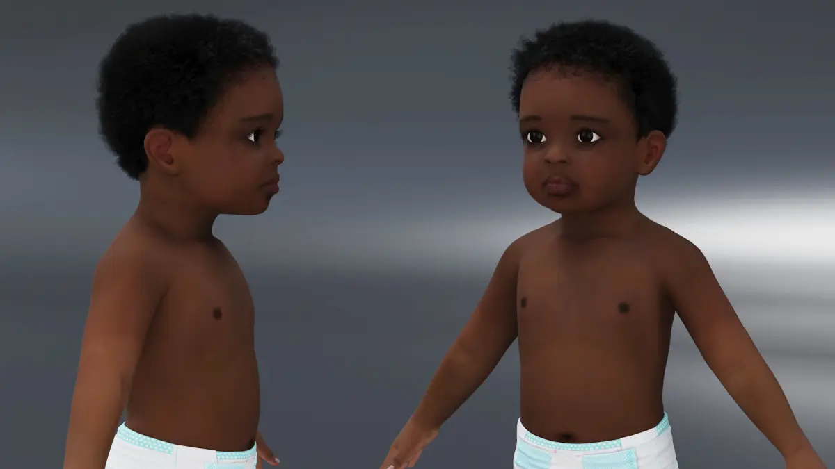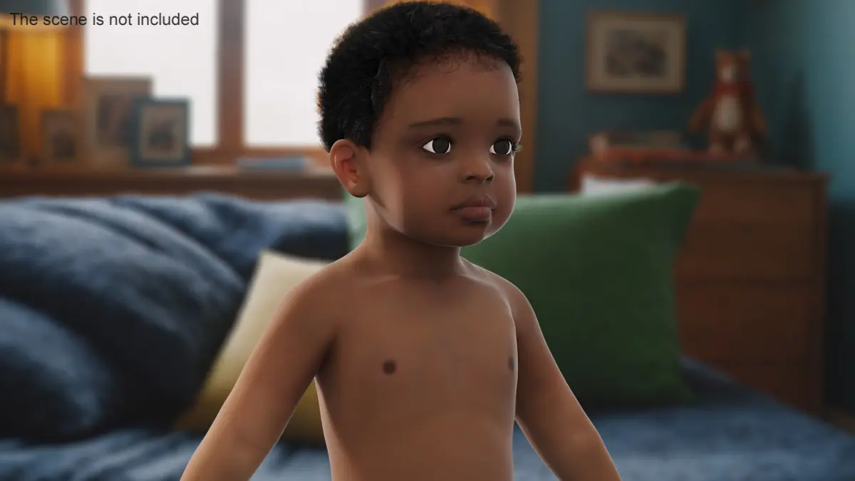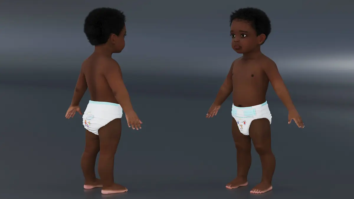 Black Baby Boy Wearing Diaper A-Pose is a high quality, photo real 3d model that will enhance detail and realism to any of your rendering projects. The model has a fully textured, detailed design that allows for close-up renders, and was originally modeled in 3ds Max 2020 and rendered with V-Ray. Renders have no postprocessing!