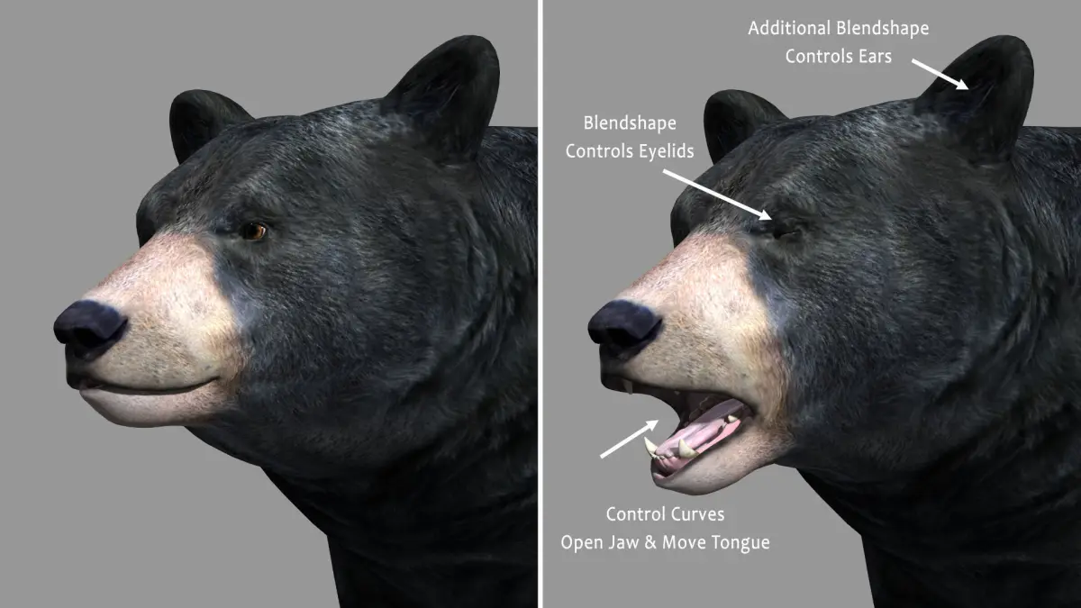 - Besides the body and limbs, rig also controls eyes, ears, mouth and tail movements.
