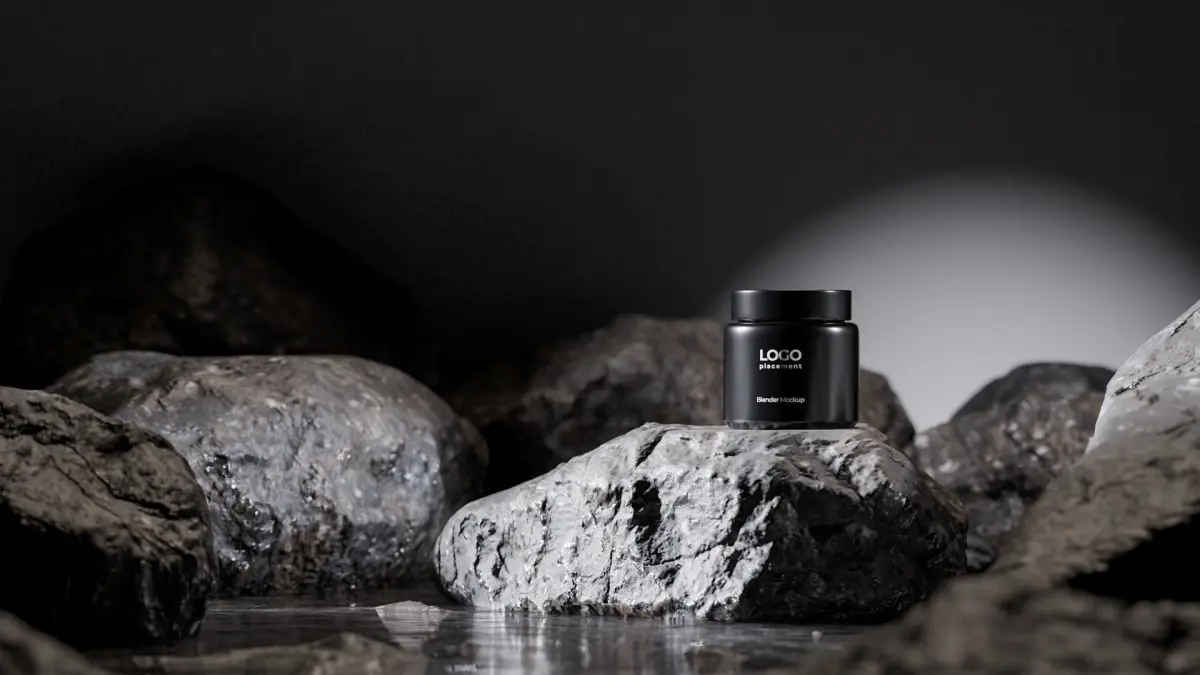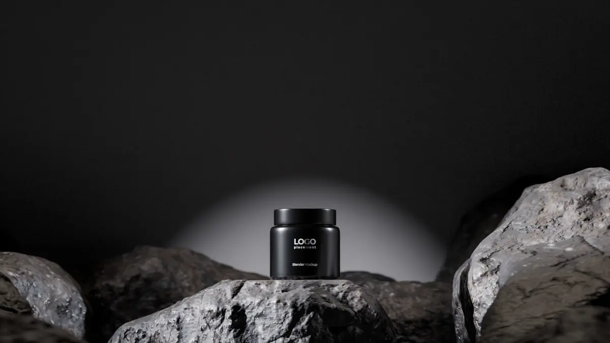 Minimalist black beauty container mockup displayed on a rugged rock podium with dramatic lighting. Ideal for skincare, cosmetics, or branding presentations.