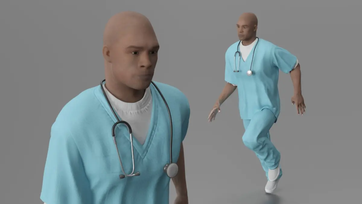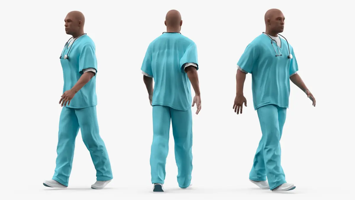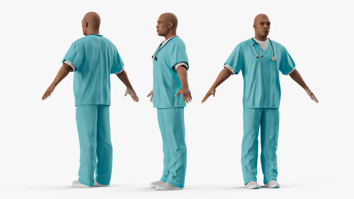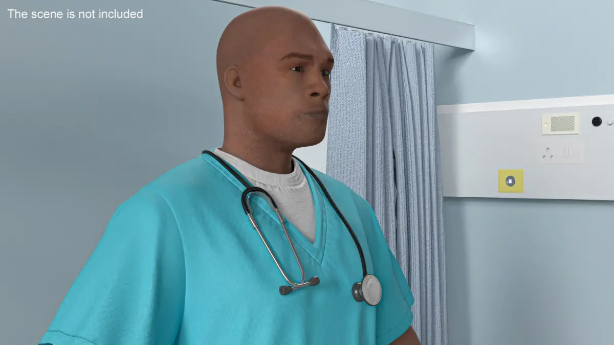 Black Health Care Worker in Overalls Rigged for Maya is a three-dimensional model of medical professional in scrubs who is a healthcare worker dressed in standard medical attire, commonly known as scrubs, complete with a stethoscope.