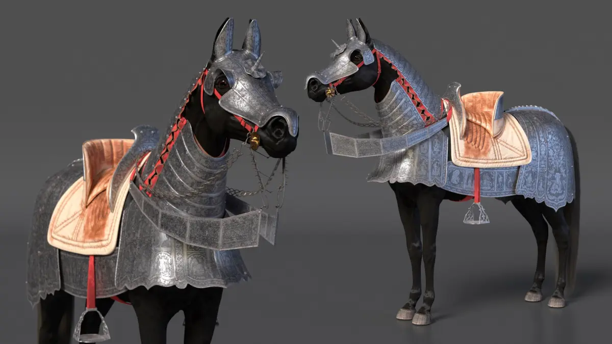 Black Horse in Used Medieval Armor Fur is a high quality, photo real 3d model that will enhance detail and realism to any of your rendering projects. The model has a fully textured, detailed design that allows for close-up renders, and was originally modeled in 3ds Max 2020 and rendered with V-Ray. Renders have no postprocessing!