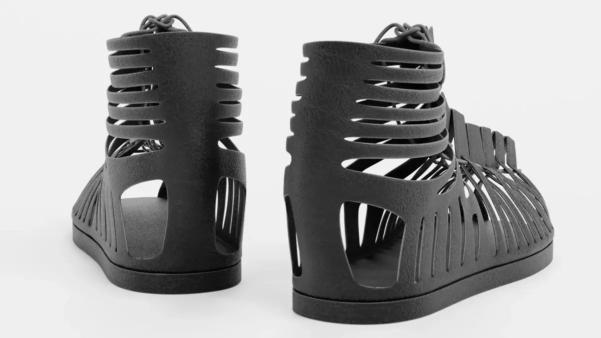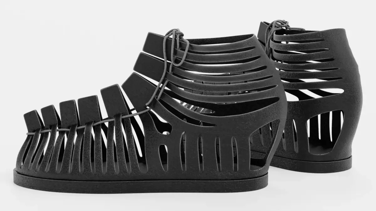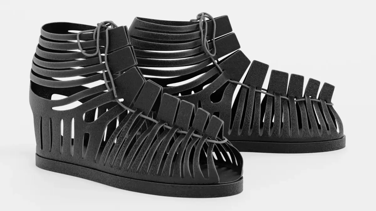 A realistic 3D model of black leather sandals with multiple straps and an open design. The model emphasizes accurate proportions, clean strap intersections, and subtle surface detailing that captures the natural texture of leather. Designed as a neutral, production-ready asset with a professional, wearable look.