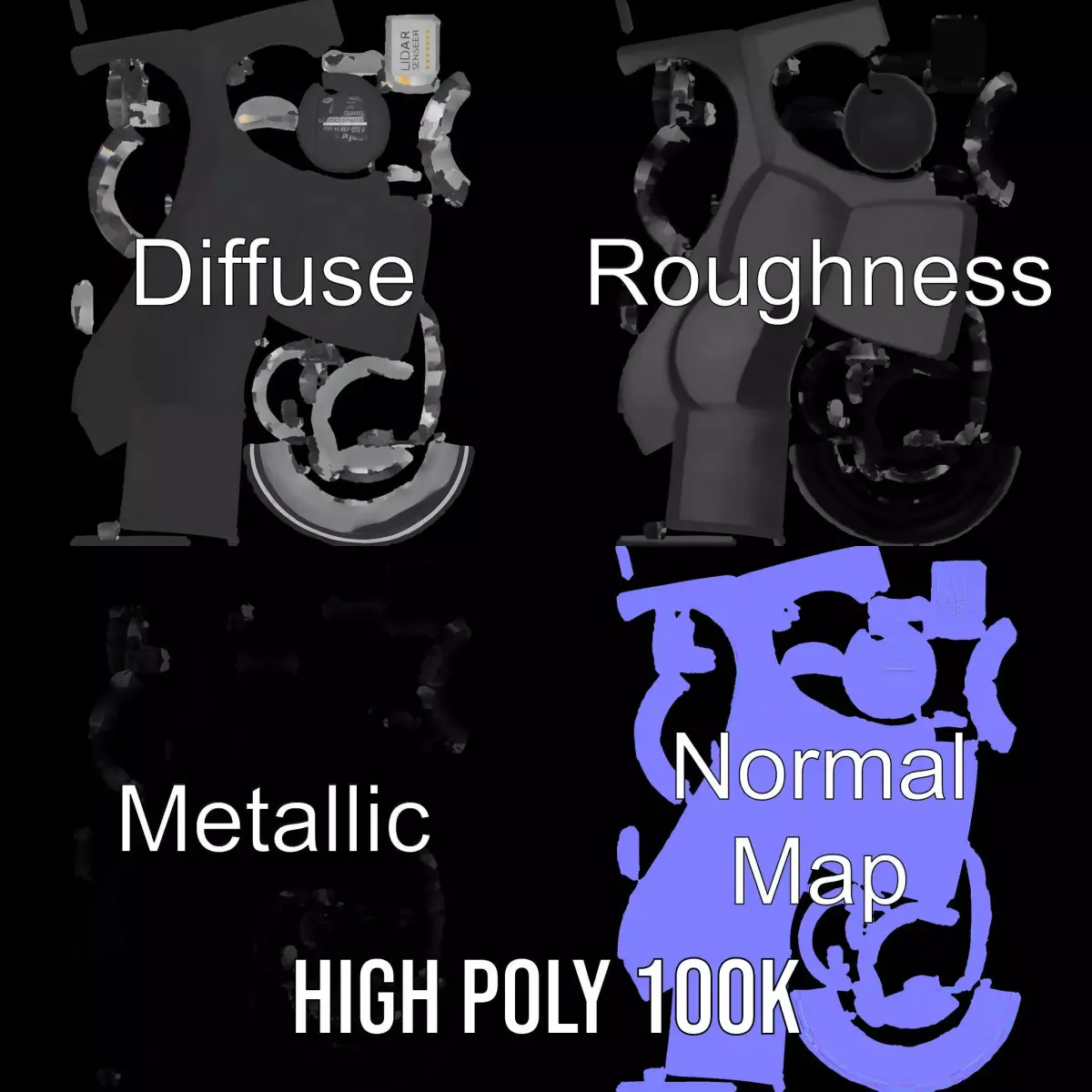 This highly detailed Black Lidar Sensor model is designed for versatile applications, including robotics, autonomous vehicles, and architectural visualization. Each model has 3 levels of detail: low-poly (1000 triangles for mobile), middle-poly (10,000 triangles for environment), and high-poly (100,000 triangles), which allows for the use of this model in production rendering (such as 3ds Max, Maya, Cinema 4D, Blender, Vray/Corona/Cycles), game engines (Unity and Unreal compatible), and interactive presentations, providing a choice of detail based on the LOD system principle. The model's textures are PBR, Diffuse, NormalMap, and reflection/roughness/metallic, which are suitable for any modern rendering engine. All models accurately unwrapped and have no overlapping UVs. All textures are 4096x4096 in size. Please like and leave a comment for the model if you enjoy it.