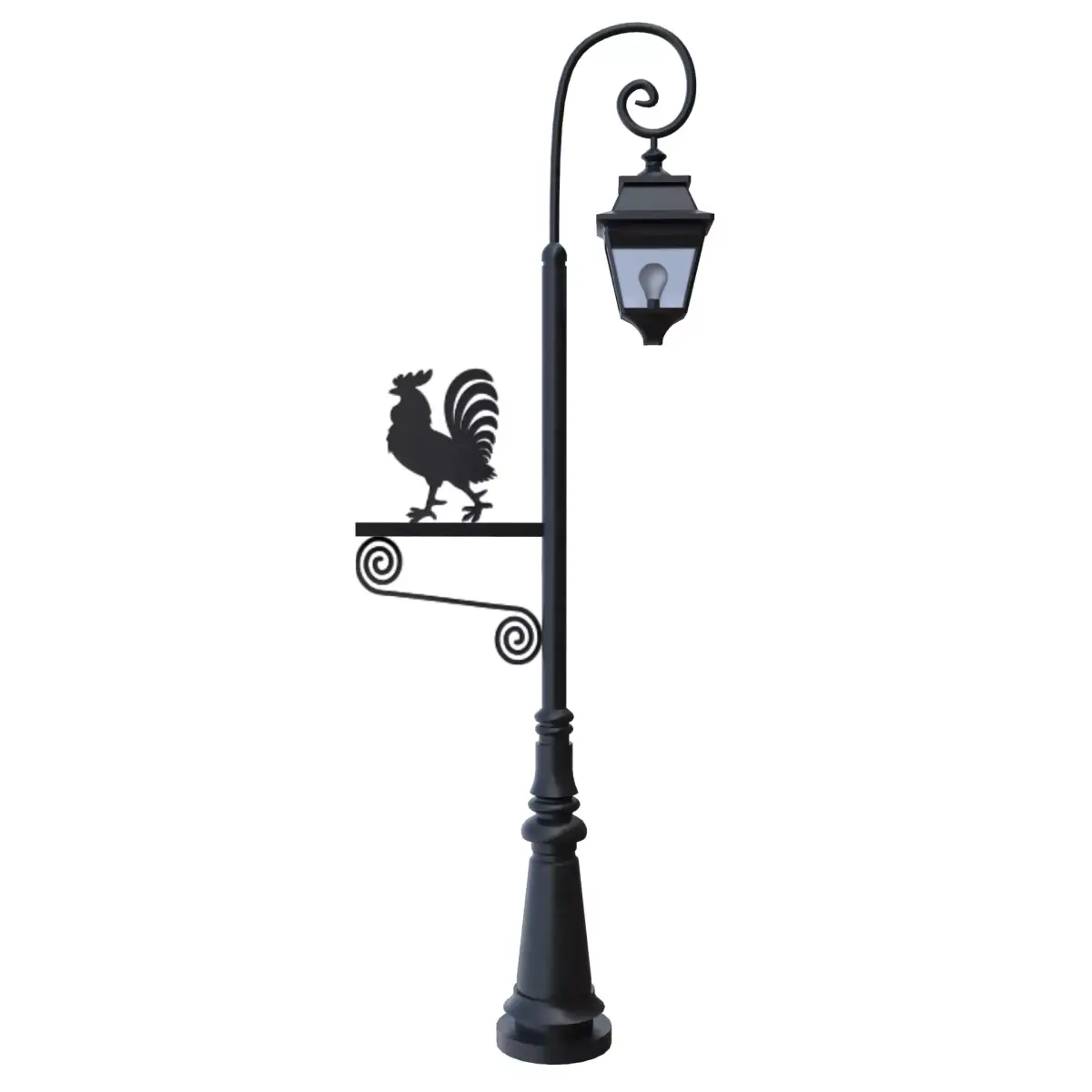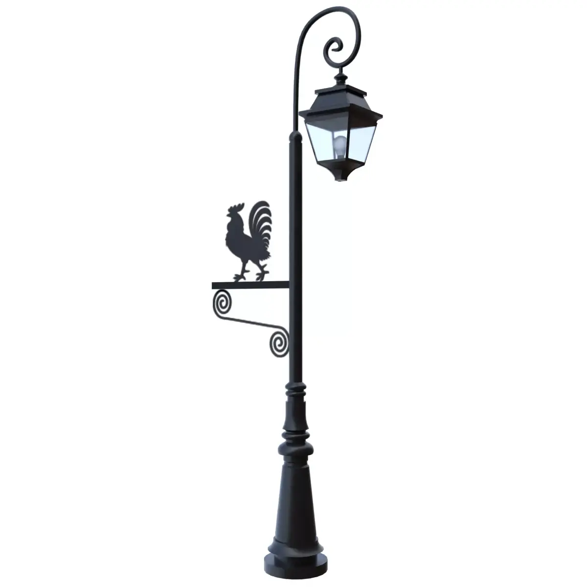 Enhance your project with this carefully crafted vintage street lamp post featuring a decorative rooster silhouette sign and elegant wrought-iron detailing. Designed with realism, efficiency, and production quality in mind.