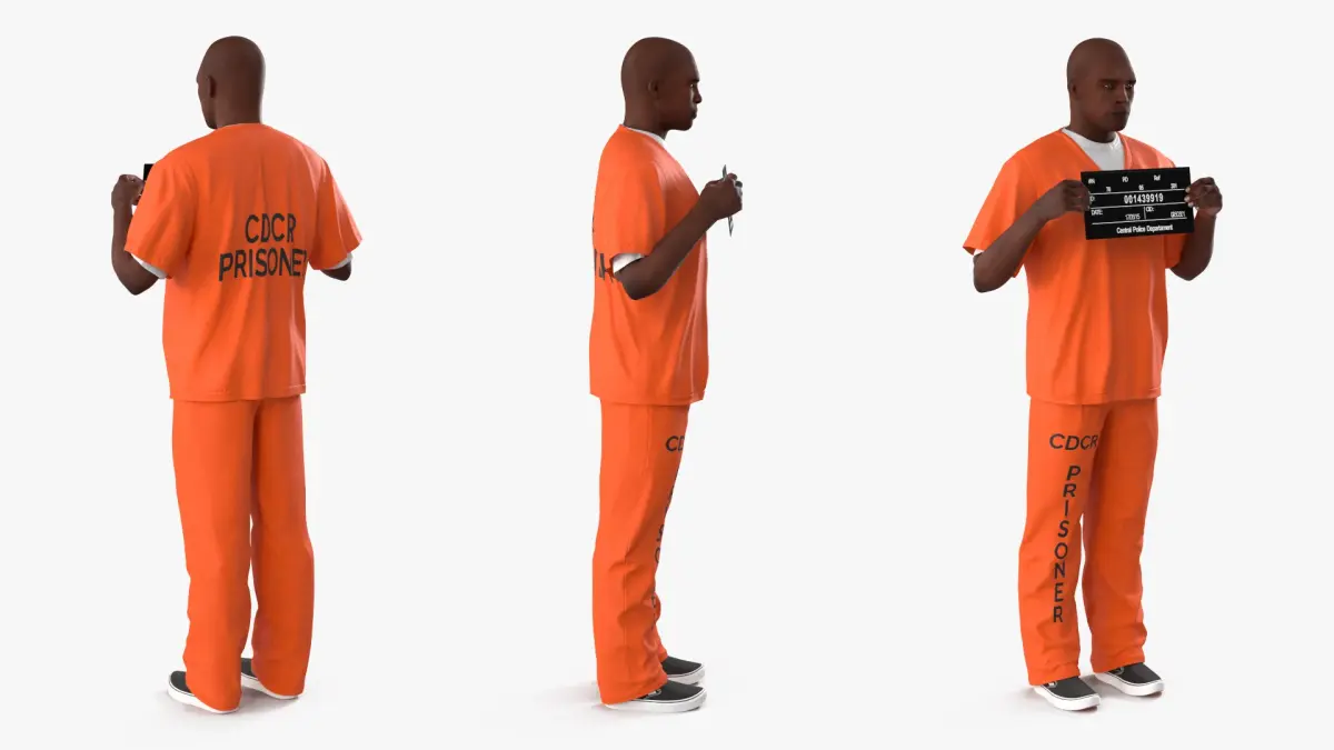 Black Male Prisoner with Mugshot Board is a three-dimensional model of casual African-American, African American, Afro-American, Afro American, Aframerican, or Black prisoner, who is an incarcerated male individual holding a mugshot sign, and who is depicted wearing standard prison attire.