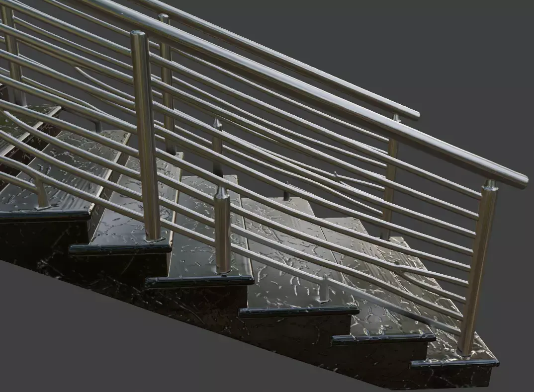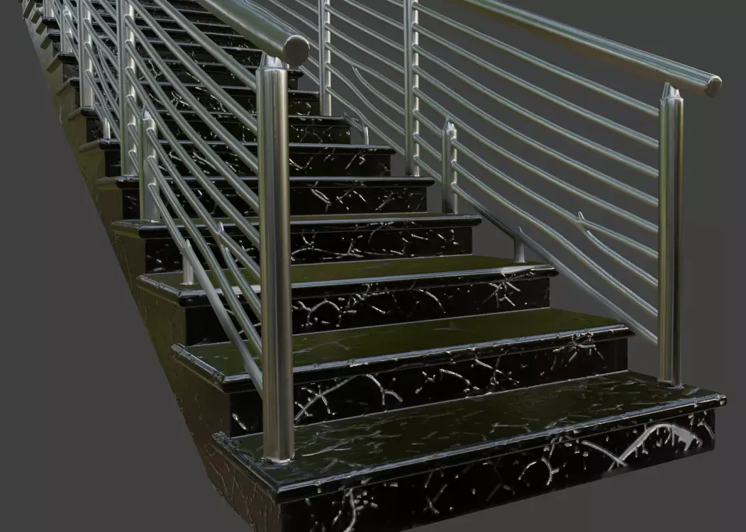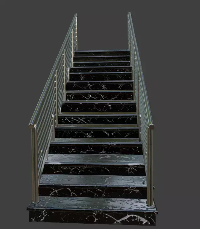 A modern high-detail 3D model of a bold straight staircase featuring glossy black marble steps with striking white veining, paired with minimalist stainless steel horizontal cable railings and polished metal handrails. Ideal for luxury modern homes, high-rise interiors, upscale commercial spaces, architectural visualization, and premium real estate renders.
