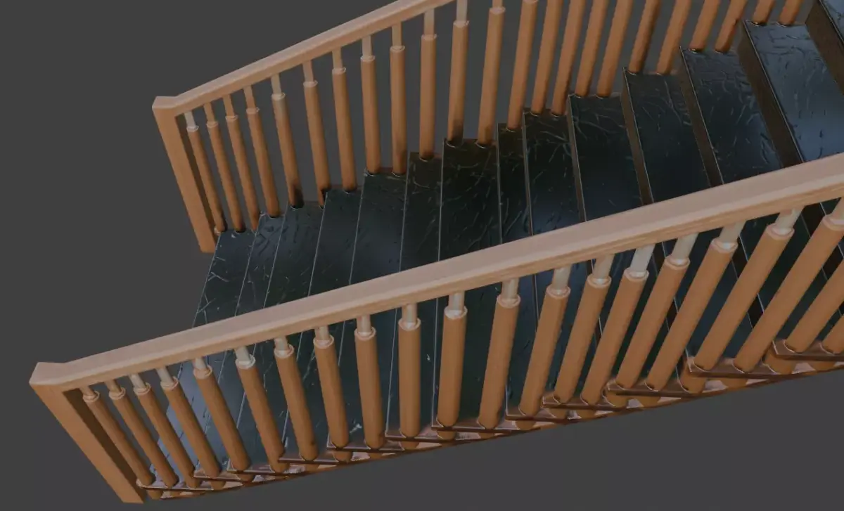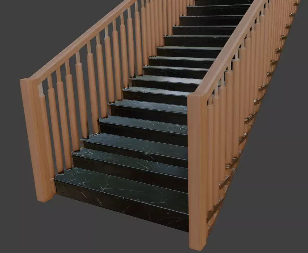 A striking high-resolution 3D model of a luxurious straight staircase featuring deep black marble treads with dramatic white veining, complemented by warm natural wood handrails and sleek chrome-accented balusters. Ideal for upscale modern interiors, luxury residences, boutique hotels, architectural visualization, and premium real-estate presentations.