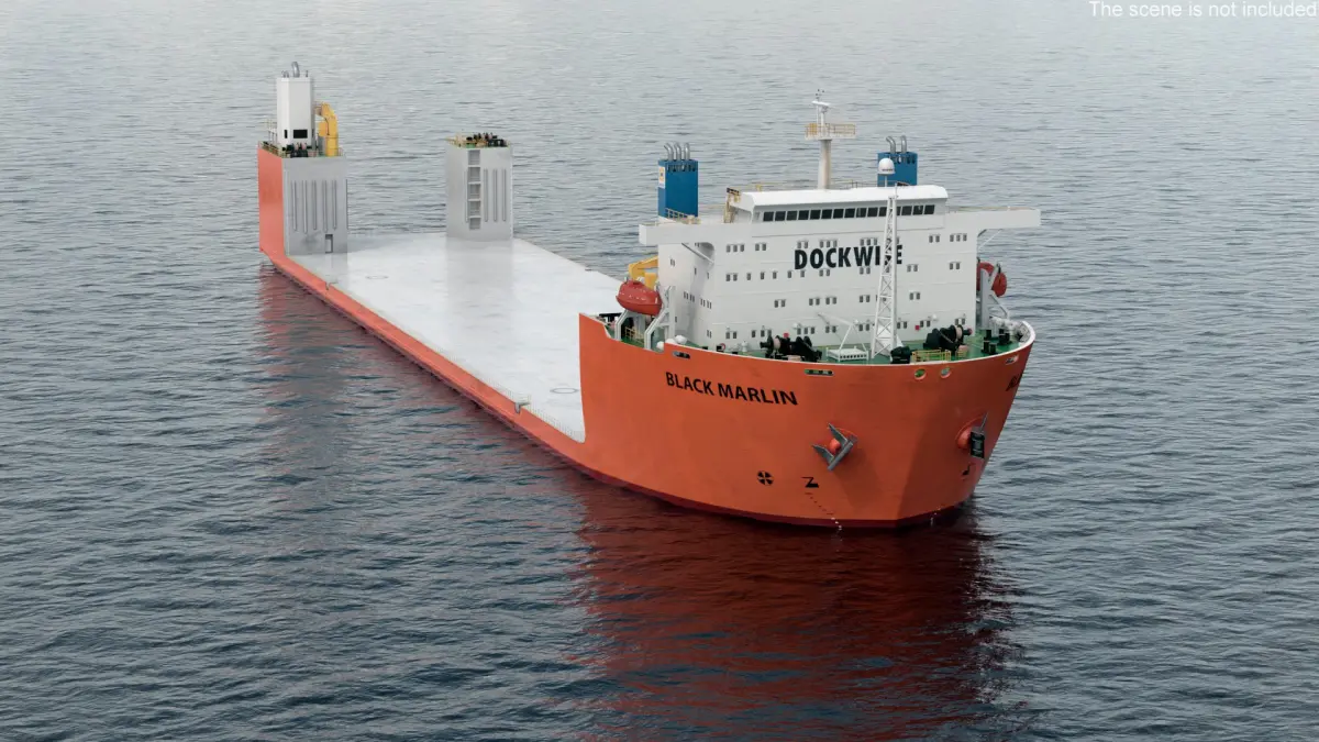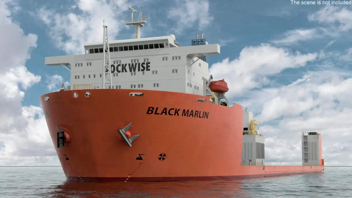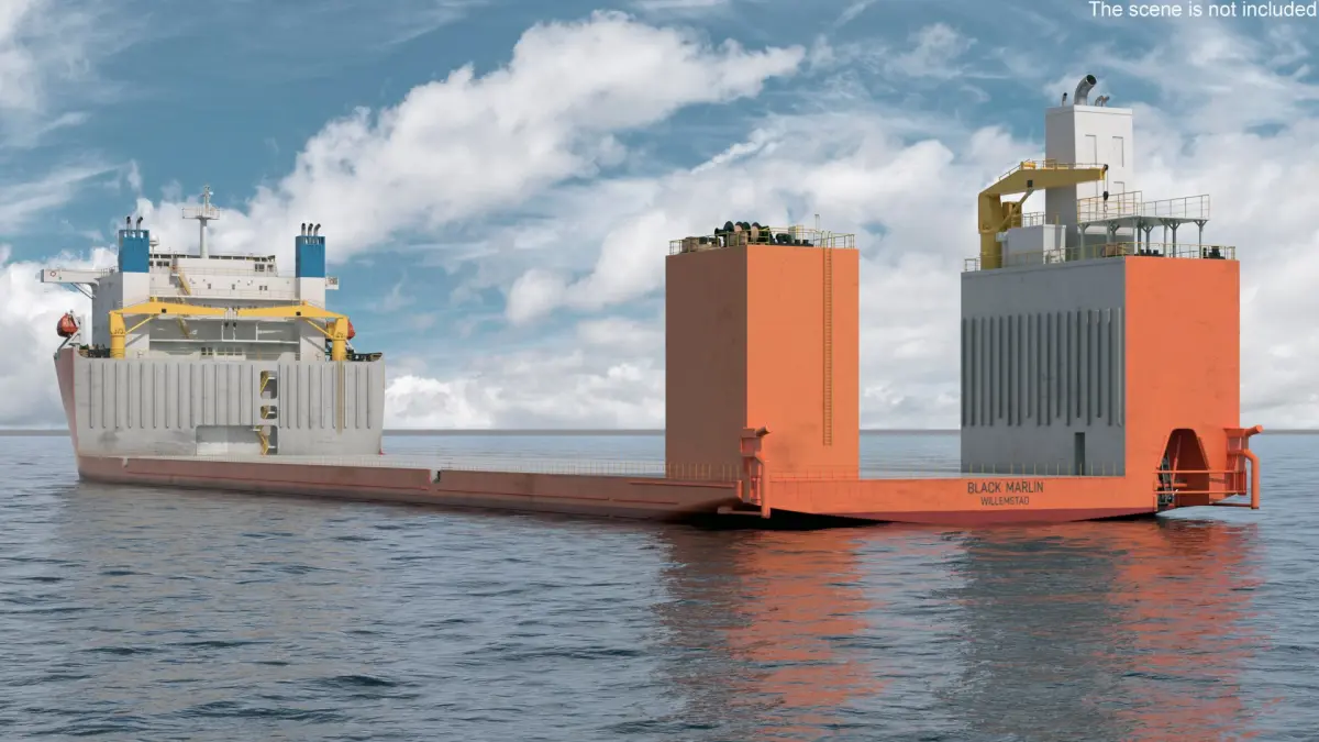 Black Marlin Heavy Lift Vessel Rigged is a 3d model of a specialized vessel designed for transporting extremely large loads across the sea.