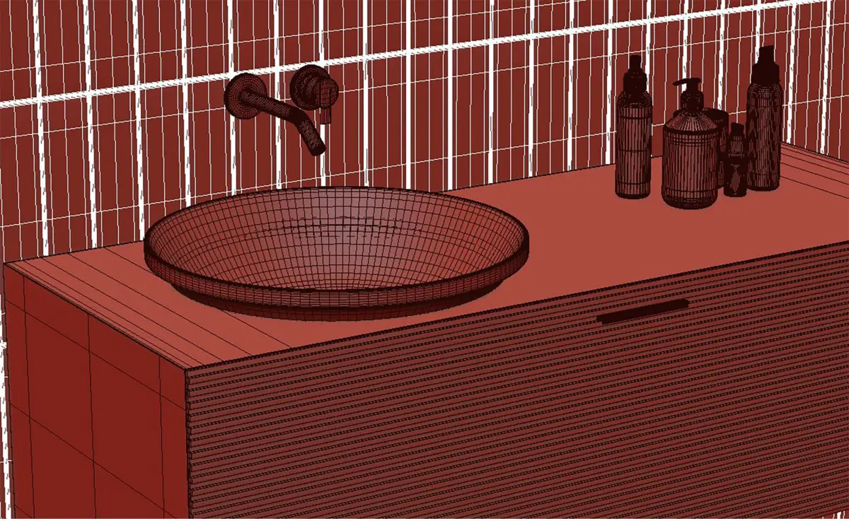 Architectural details are painstakingly modeled, including full windows, carpet, cabinet, bathtub, faucet, lights, soaps, pendant lighting.