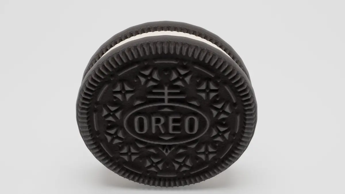 The details are immaculate, from the finely textured surface of the biscuit to the creamy layer that sits in the center. The 3D model skillfully highlights the cookie's signature embossed pattern, adding a touch of realism to the digital representation. Each nuance, from the delicate edges to the crumbly texture, is expertly rendered to evoke the sensory delight of biting into an actual Oreo.
