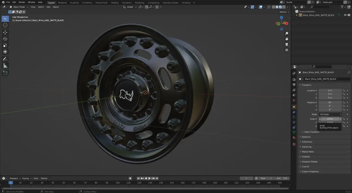 Detailed Model of the Black Rhino AXEL Matte Black Rim.Original size 20 inches.4K texturesUnwrapped UVs Non-OverlappingFormats: .blend (3.1) .gld .fbx .ma (2018) .max(2016) VRay 3.20