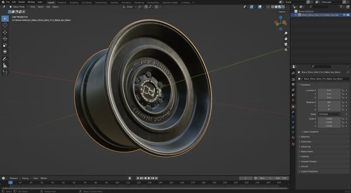 Detailed Model of the Black Rhino Solid Matte Gun Black Rim.Original size 17 inches.4K texturesUnwrapped UVs Non-OverlappingFormats: .blend (3.1) .gld .fbx .ma (2018) .max(2016) VRay 3.20