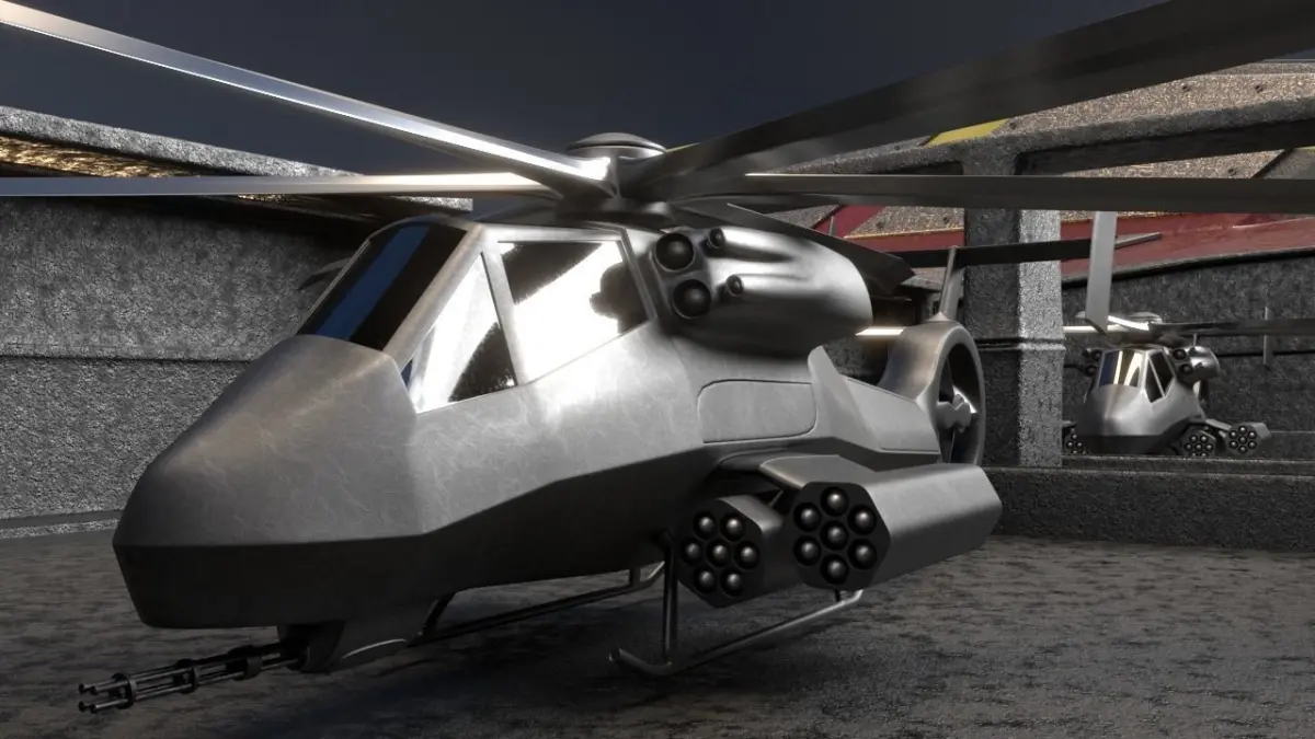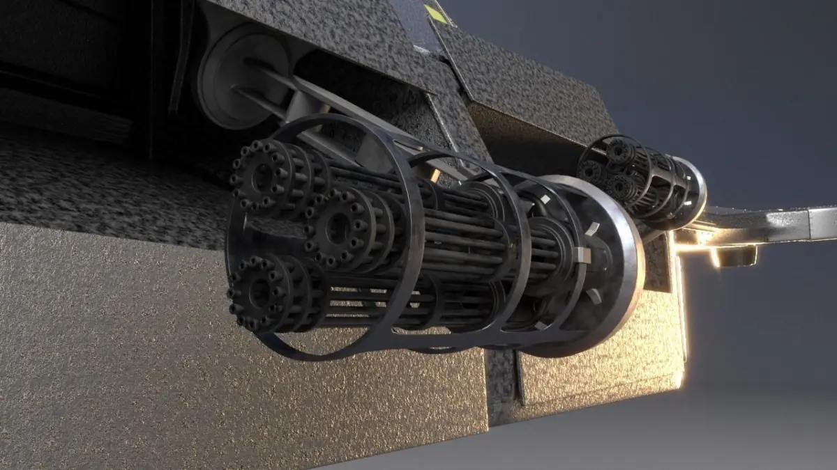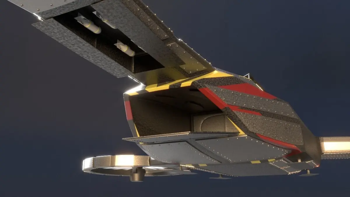 with 4 rigged helicopter, 4 rigged machine gun, 2 rigged radar , 1 rigged plasma cannon, 4 rigged legs, 4 missile, 4 **bomb,** behind the rigged doors
