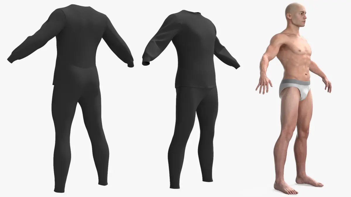 Black Slim Fit Undergarment Worn on Man is a three-dimensional model of male character in the specialized, long sleeve, fit, stretch, slim, bodysuit style, thermal underwear (undergarment).