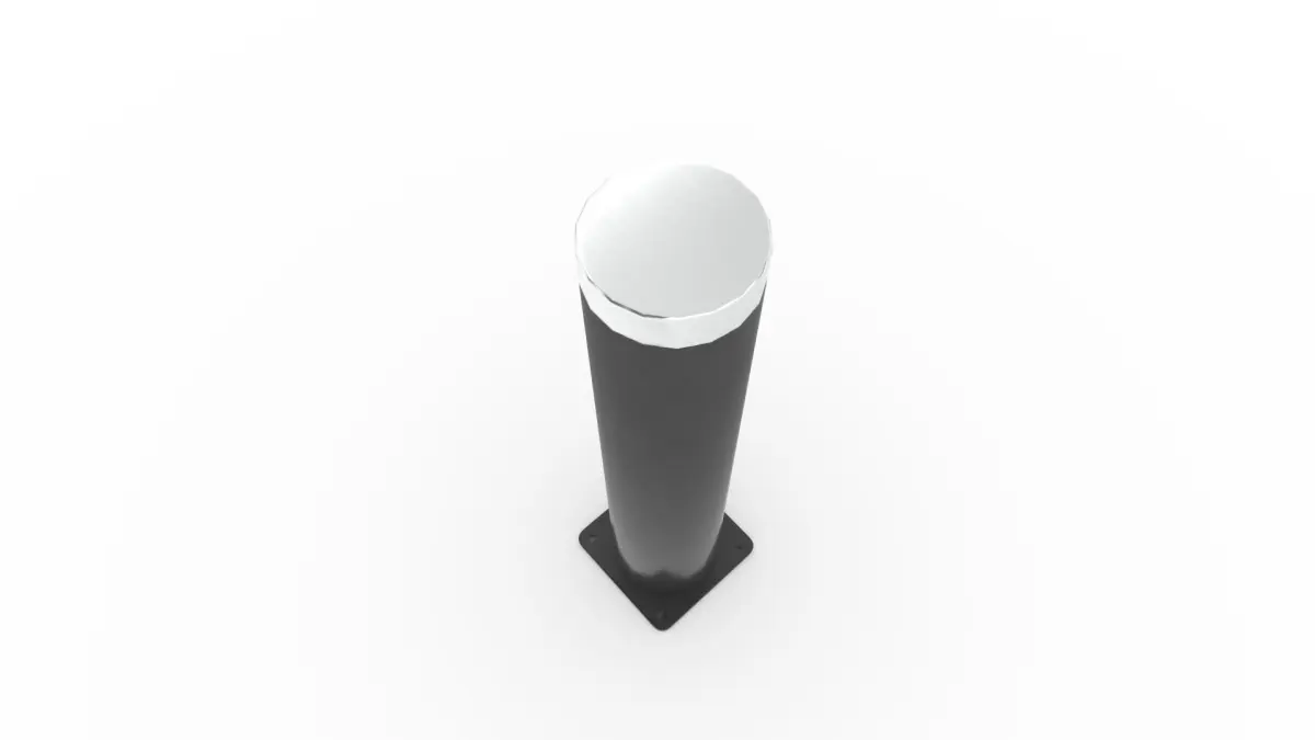 A contemporary black cylindrical bollard, stainless steel with a ground mounting plate. Perfect for city or urban landscapes.